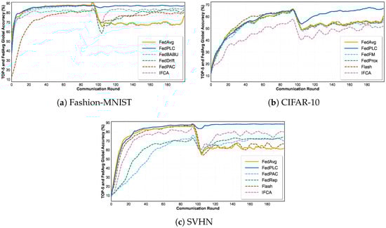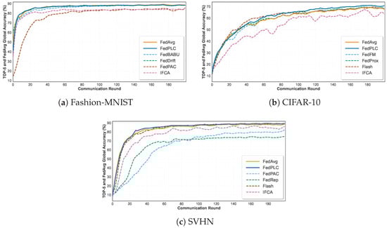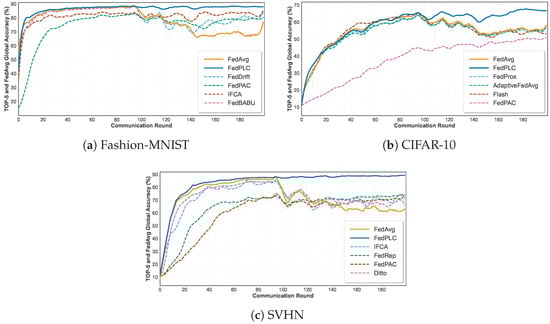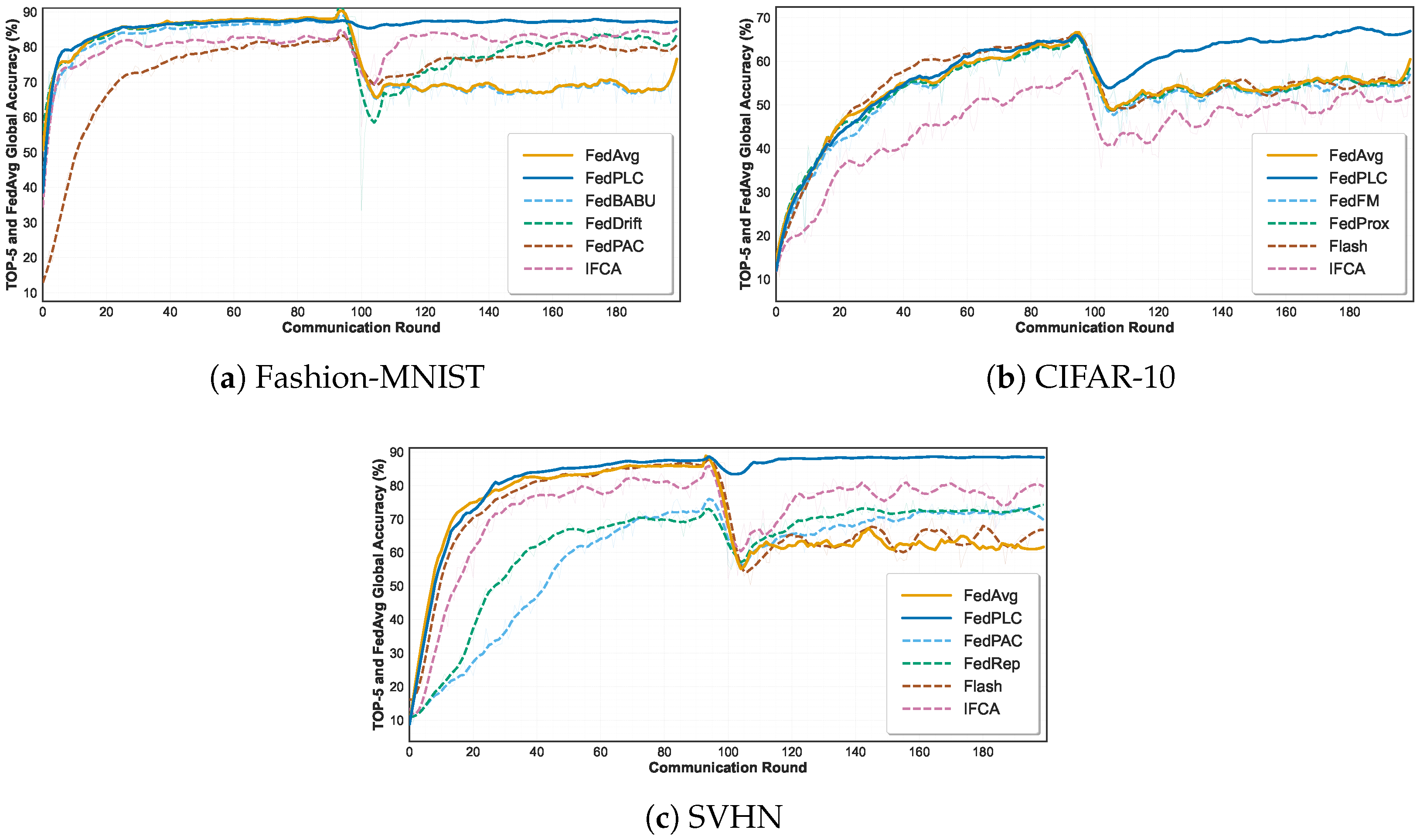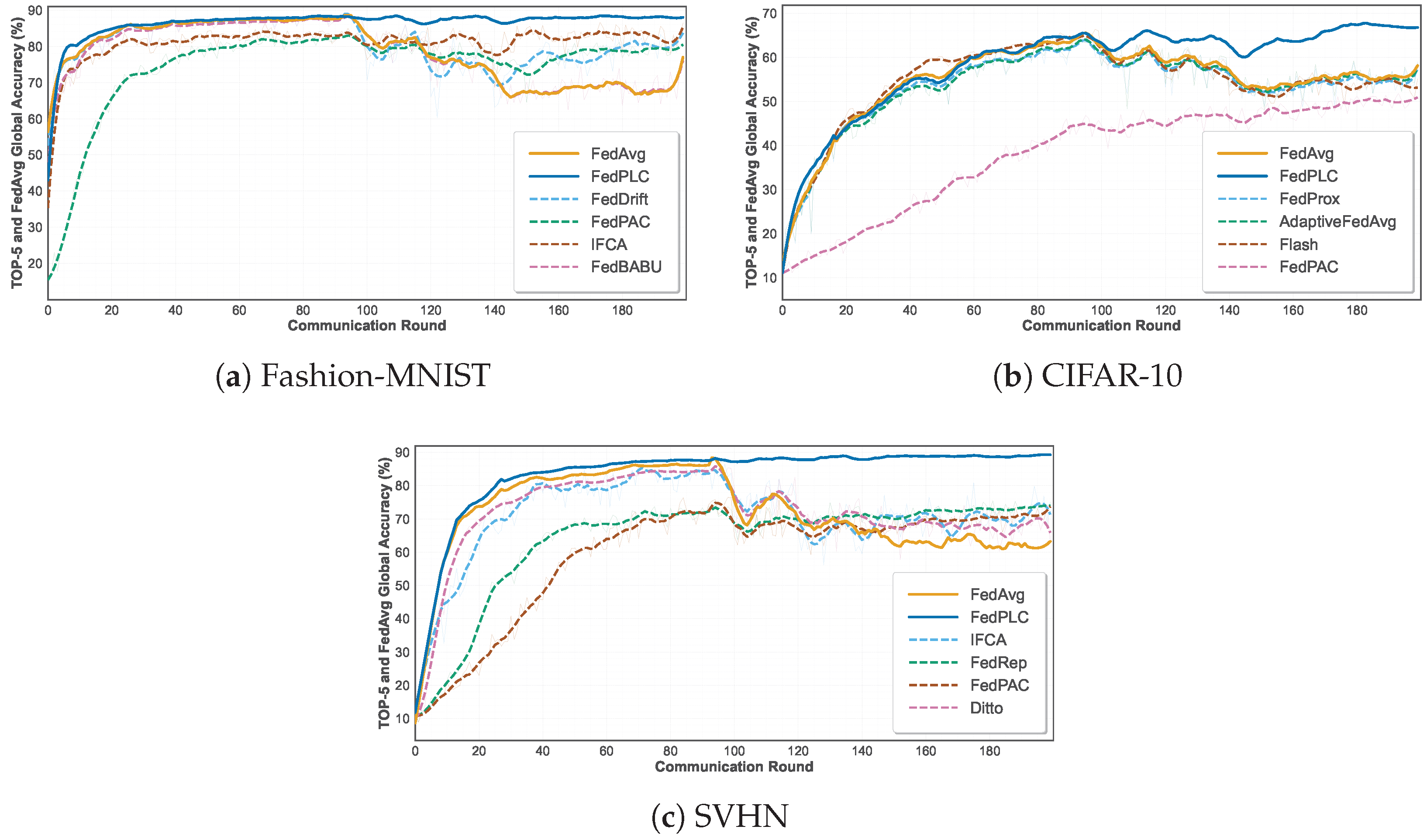 39]. Fashion-MNIST contains 70,000 grayscale images of size 28 × 28, with 60,000 training samples and 10,000 test samples, covering 10 clothing categories. CIFAR-10 consists of 60,000 color images of size 32 × 32 × 3 (RGB, 50,000 for training and 10,000 for testing) across 10 common object classes such as airplanes, cars, and animals. SVHN is collected from real-world street view images and includes about 73,000 training samples and 26,000 test samples, with images of size 32 × 32 × 3 representing digits from 0 to 9. Compared to Fashion-MNIST and CIFAR-10, SVHN has higher background complexity and noise levels, more closely resembling the non-ideal data distribution scenarios of the real world. Collectively, these three datasets are representative in terms of sample size, feature dimension, and data complexity, helping to comprehensively evaluate the robustness and generalization ability of FedPLC in heterogeneous federated learning environments from multiple perspectives.