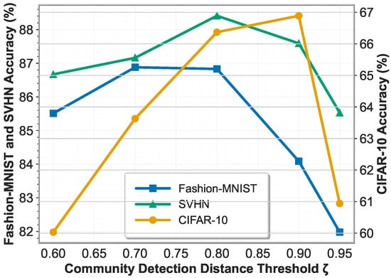 Notably, CIFAR-10 is most sensitive to threshold selection, reflecting its complex visual semantics and high inter-class confusion. In contrast, Fashion-MNIST and SVHN are relatively more robust but exhibit the same trend. These results confirm that the community detection threshold plays a crucial role in balancing individualization and collaboration in FedPLC.