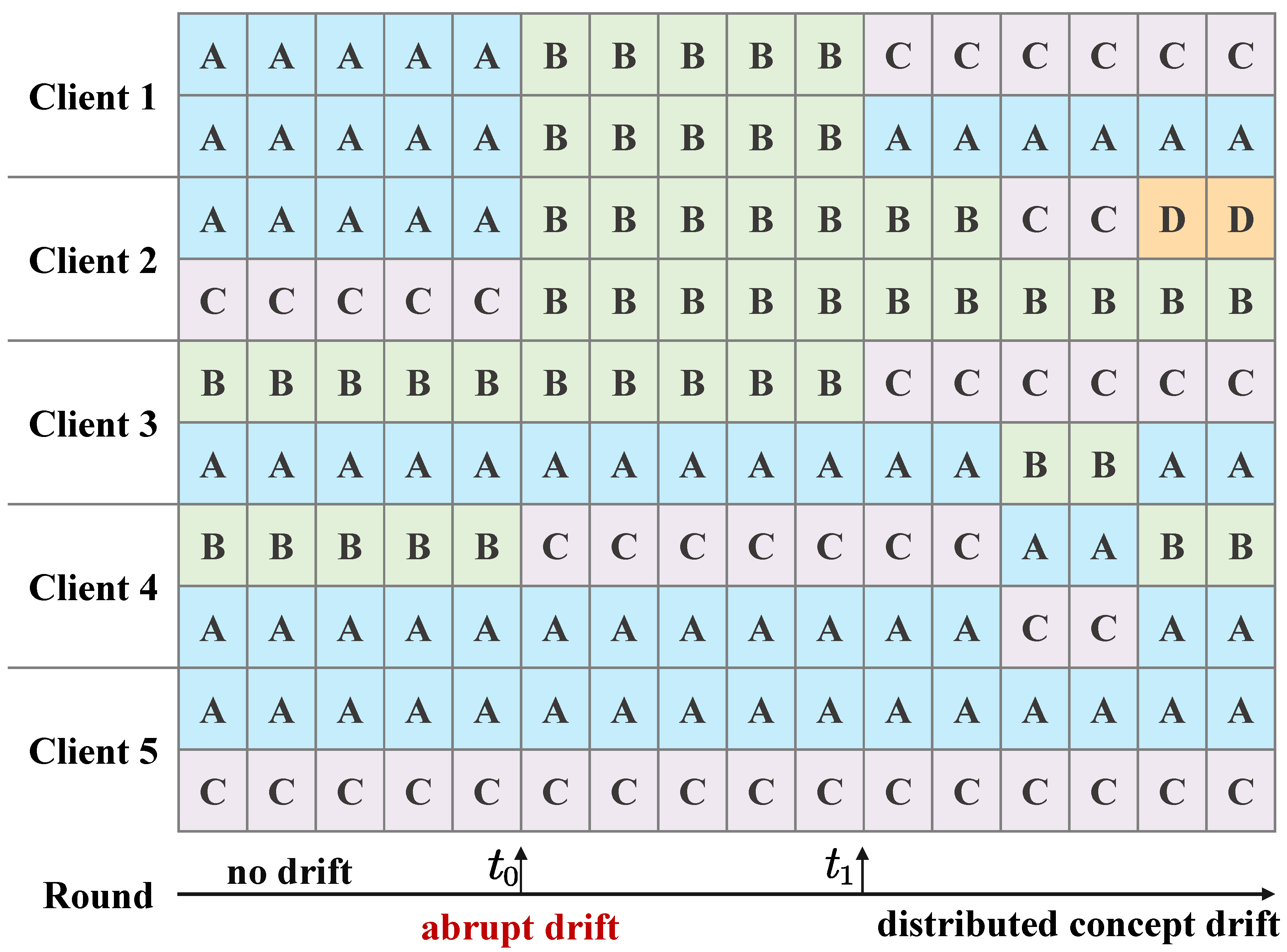 Figure 1 illustrates the temporal evolution of local data concept states across different clients, covering three representative regimes: a drift-free baseline, an abrupt concept drift, and the most challenging distributed concept drift, thereby highlighting multiple forms of concept drift over successive communication rounds. Each colored block represents the dominant data concept (A, B, C, or D) observed by a client at a given round. In the initial rounds