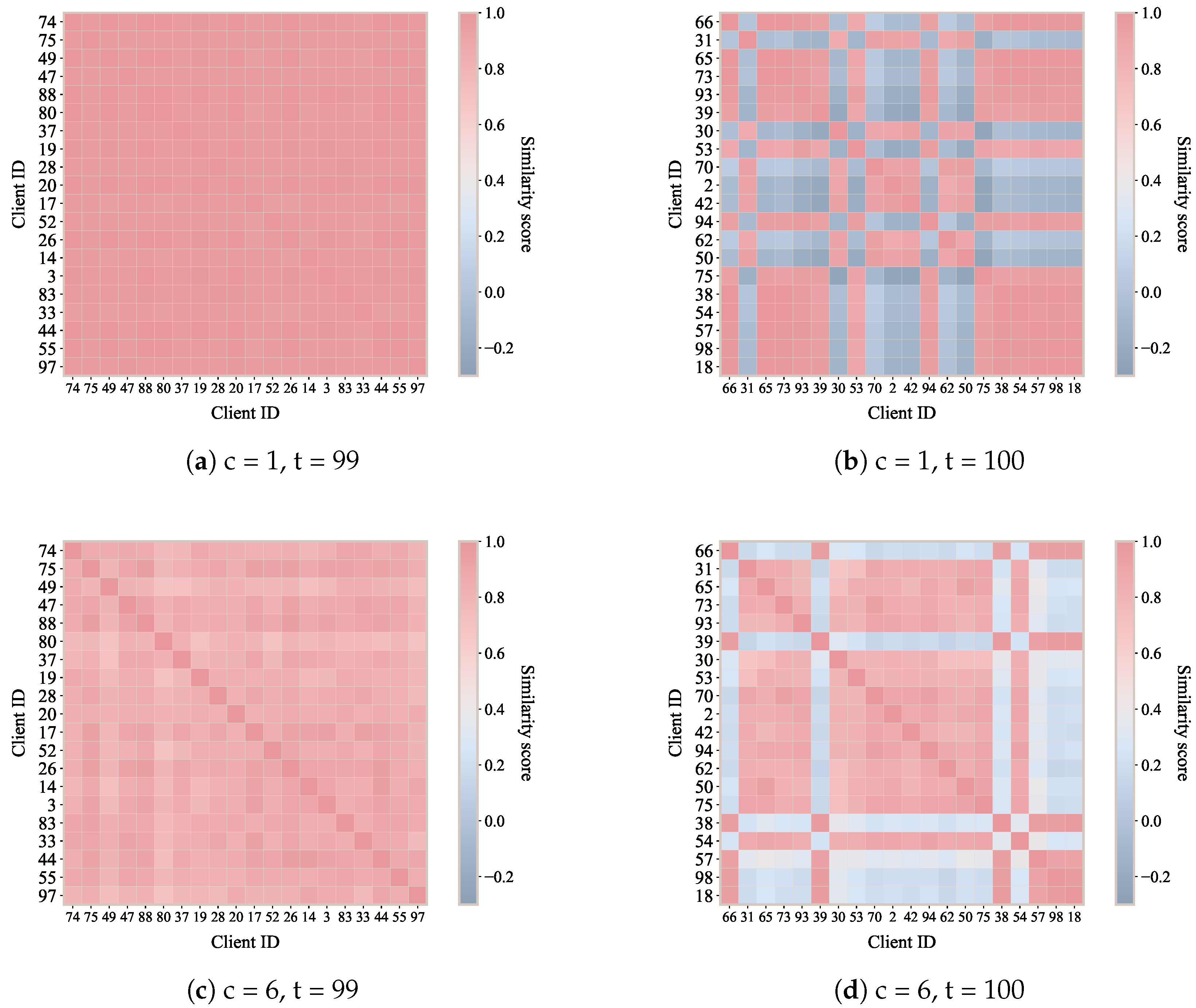 Consider a personalized FL scenario with a central server and clients. Each client maintains a local dataset , where denotes the number of samples on client i. The data are distributed according to , where X is the input space and Y is the label space containing C categories. Each client maintains a personalized model, which consists of a shared representation layer and a client-specific classifier . Unlike traditional FL where a single global model is trained, the goal here is to learn models that adapt to the local data distribution of each client, whereas knowledge from other clients is leveraged through prototype-based aggregation and label-wise classifier clustering.