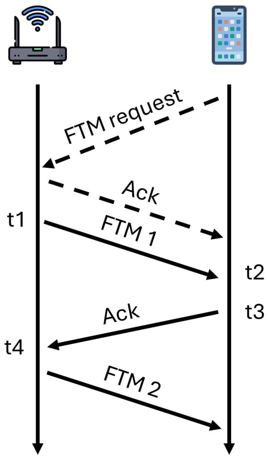As shown in Figure 2, the initiation of RTT protocol is the transmission of a FTM request from the initiator (smartphone) to the responder (WiFi AP), specifying message count and intervals. Upon reception, the WiFi AP transmits a series of FTM messages, awaiting acknowledgment. The responder meticulously timestamps each FTM dispatch () and acknowledgment receipt (), subsequently calibrating these timestamps using its internal clock. Simultaneously, the initiator acknowledges each FTM message, recording reception time () and acknowledgment transmission (). Exchange of these temporal details allows both parties to calculate the round trip time, propagation time, and therefore the distance between the smartphone and WiFi AP is defined as