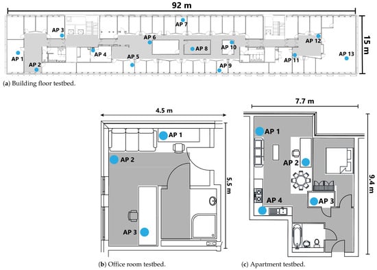 To evaluate the performance of the proposed reliable WiFi-based indoor positioning system, examine the robustness across devices and time and demonstrate the generalisation of the results, we conducted experiments in three representative and challenging real-world environments: a full floor of a campus building, an office room, and a residential apartment (see Figure 3) [26]. This dataset includes WiFi RTT and RSS measurements, along with line-of-sight (LoS) annotations for every reference point. These three datasets were collected over different time period in real-world complex scenarios that contain distinguishing LoS conditions. Each reference point comprises more than 120 WiFi scans, as shown in Table 1. A desktop PC equipped with an Intel Core i9-12900K processor (Intel Corporation, Santa Clara, CA, USA) and 32 GB DDR4 4000 MHz memory (G.SKILL International Enterprise Co., Ltd., Taipei, Taiwan) was used to analyse the results. On the largest building floor dataset, the model training time was 1.6 s, and the average generation time for each q-value was 0.2 s. These low computational requirements indicate that the proposed approach is lightweight and amenable to practical deployment.