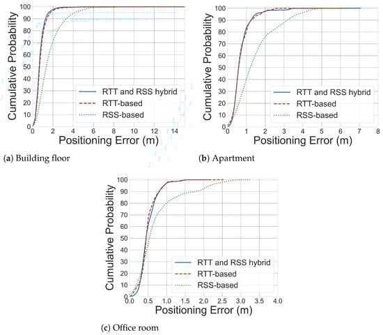 To evaluate the performance of the proposed reliable WiFi-based indoor positioning system, we employ a Random Forest (RF) model as the primary predictor, as it has been identified in the literature [26] as one of the most effective approaches for this task. As illustrated in Figure 4 and Table 5, the hybrid WiFi RTT and RSS-based indoor positioning system delivers the most promising positioning estimation, with an accuracy of 0.6 m for the challenging large-scale real-world Building Floor dataset. The positioning accuracy achieves 0.59 m and 0.38 m for Apartment and Office Room dataset, respectively. It is observed that, even in the complex building-floor dataset containing mixed line-of-sight (LOS) and non-line-of-sight (NLOS) conditions, the hybrid system that combines WiFi RTT and RSS measurements achieves a positioning accuracy below 1 m, 80% of the time.