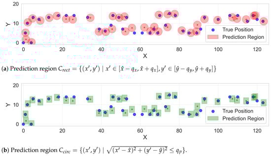 where is centered at the model’s point estimate, with radius q, is the candidate location forming the predicted region. For the independent prediction of the x-coordinate, the quantity represents the half-width of the prediction interval .