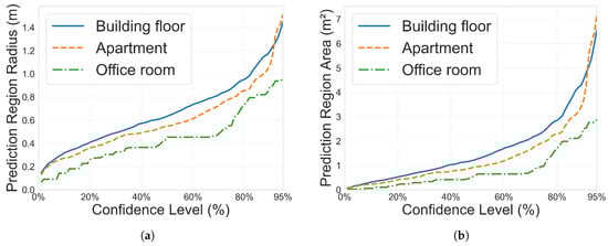 Circular prediction region radius (a) and area (b) as a function of the user-specified confidence level in different testbeds. Hybrid WiFi RTT and RSS measurements are selected as the input signal measures. It is observed from the curves that higher confidence levels always require larger prediction regions. (a) Circular prediction region radius as a function of the user-specified confidence level. (b) Circular prediction region area as a function of the user-specified confidence level.