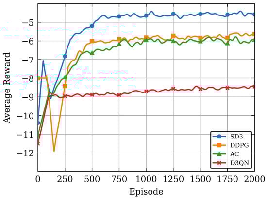 Figure 4 illustrates the convergence performance of various algorithms over 2000 training episodes. The results indicate that all algorithms converge with increased training episodes. In a holistic view, SD3 algorithm outperforms other algorithms significantly, achieving higher average rewards during training. This is primarily attributable to the enhanced framework design of the SD3 algorithm and the incorporation of the softmax operation to enhance the precision of the value function. This enables SD3 algorithm to learn and optimize strategies with greater efficiency in complex environments, and avoids the impact of overestimation and underestimation biases, thereby exhibiting superior performance during training. After 2000 episodes, the AC algorithm lags behind both SD3 and DDPG algorithms in reward value, reflecting its limited capability in handling complex tasks and the online strategy framework is underutilized for five-tuple samples, the D3QN algorithm exhibits the poorest performance due to the lower accuracy of discrete actions compared to continuous actions.