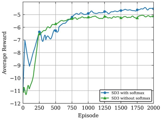 Figure 5 that the SD3 algorithm incorporating the softmax operator achieves higher average reward values. This result verifies the critical role of the softmax operator in suppressing value function estimation biases and enhancing policy optimization performance. This is mainly because the SD3 algorithm without the softmax operator resembles the basic dual-Critic architecture, which is more prone to accumulation of value estimation biases in dynamic and complex NOMA-MEC resource allocation environments, leading to larger training fluctuations and lower policy performance after convergence. In contrast, the softmax operator effectively balances biases between dual Q-estimators through a weighted smoothing mechanism based on the Boltzmann distribution, avoiding common overestimation or underestimation issues in traditional DDPG/TD3 algorithms, thereby improving the algorithm’s learning stability and final performance.