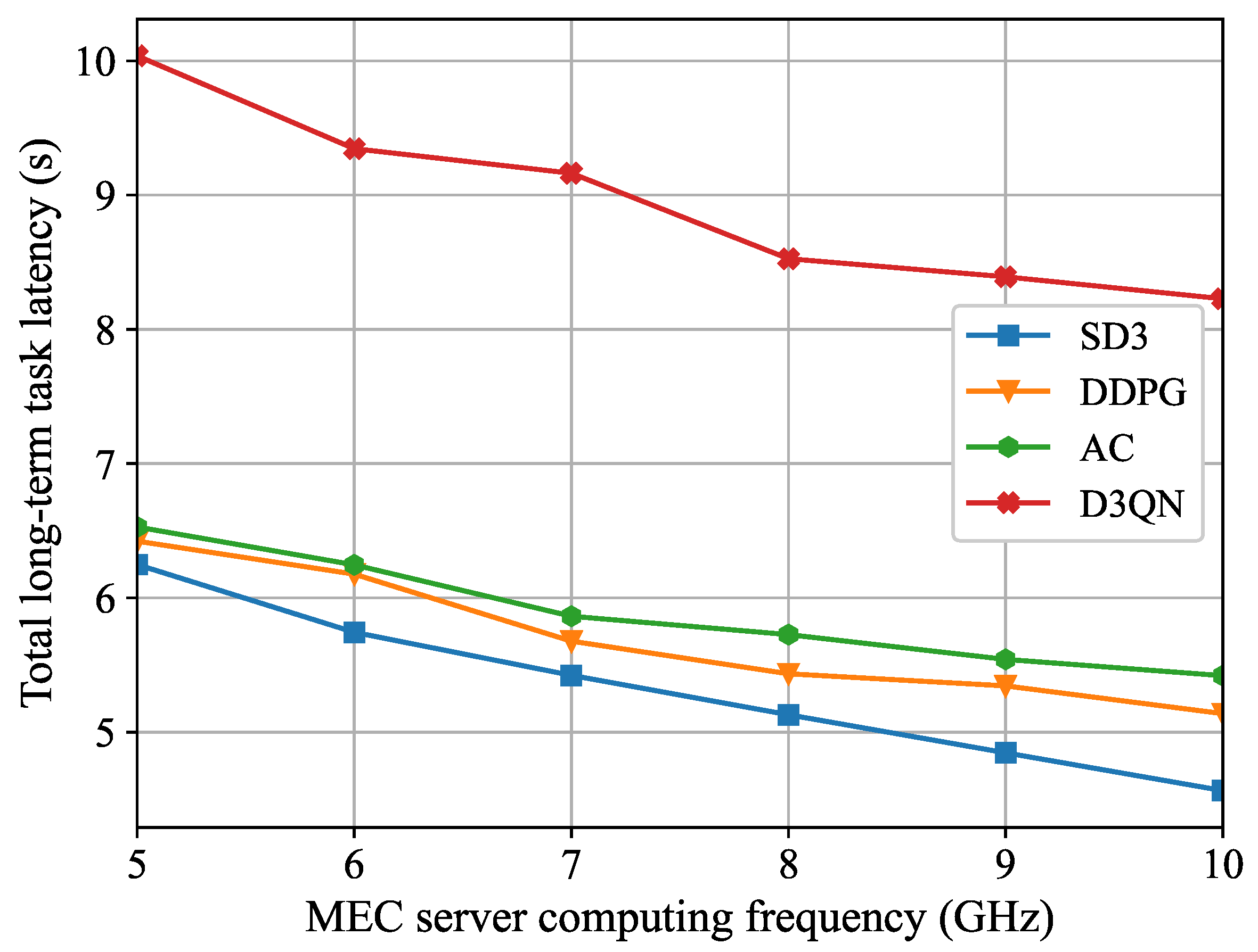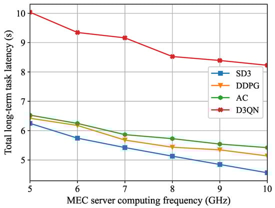 Figure 6, the total long-term task latency diminishes as the maximum computing frequency rises. This occurs because, as the computing resources of the MEC server increase, task processing speed becomes faster and task execution latency becomes smaller. Consequently, users are more inclined to reduce task execution latency through computing offloading. In contrast to the benchmark algorithms, the total long-term task latency of the SD3 algorithm is reduced by 26.9% when the computing capability is increased from 5 GHz to 10 GHz, which still maintains the lowest average latency. As the MEC server computing capability increases, the latency decreases most significantly.