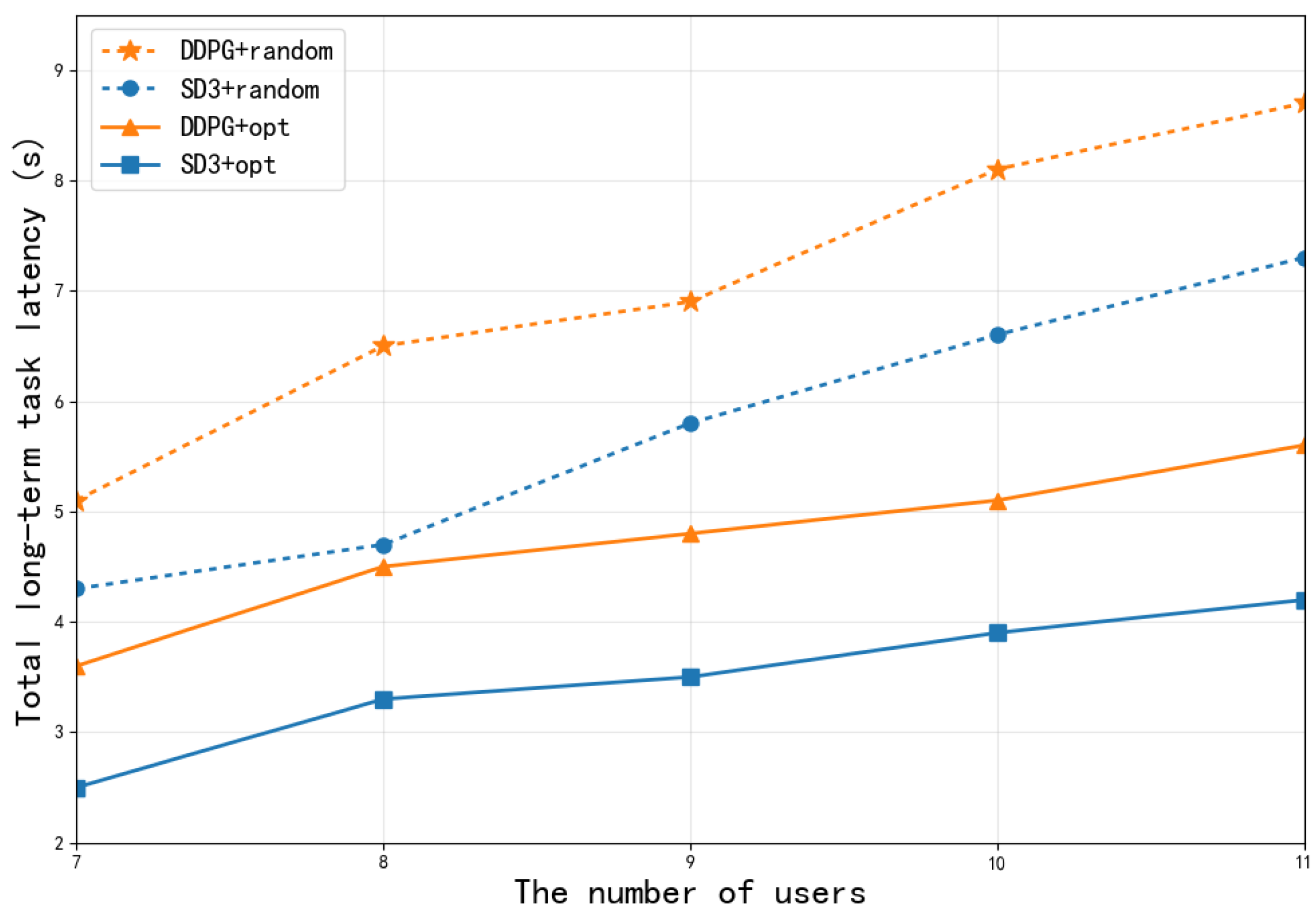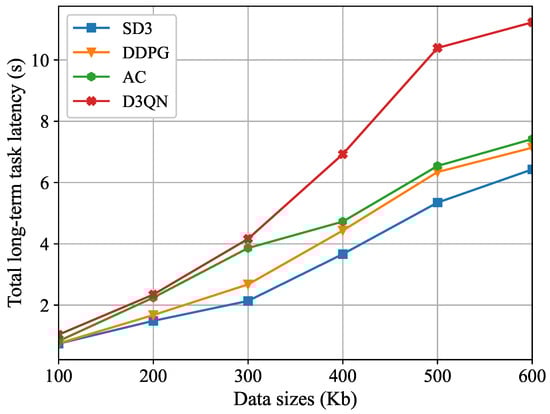 Figure 8 that the SD3 algorithm is demonstrably more effective than the DDPG, AC, and D3QN algorithms in terms of the total long-term task latency, which demonstrates the robustness of the SD3 algorithm in dynamic environments.