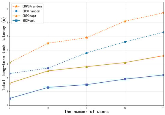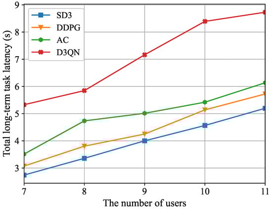 Figure 8 illustrates the connection between the total long-term task latency and the number of users. It is evident that the total long-term task latency increases progressively as the number of users grows. This is due to the increase in the number of users, which results in a greater variety of processing tasks and data sizes. However, the limited computing resources of the MEC server lead to higher computing latency, and the uplink congestion further reduces the transmission rate. In addition, as the user count grows, both the state and action dimensions that the agent must handle will expand. Moreover, we also can see from