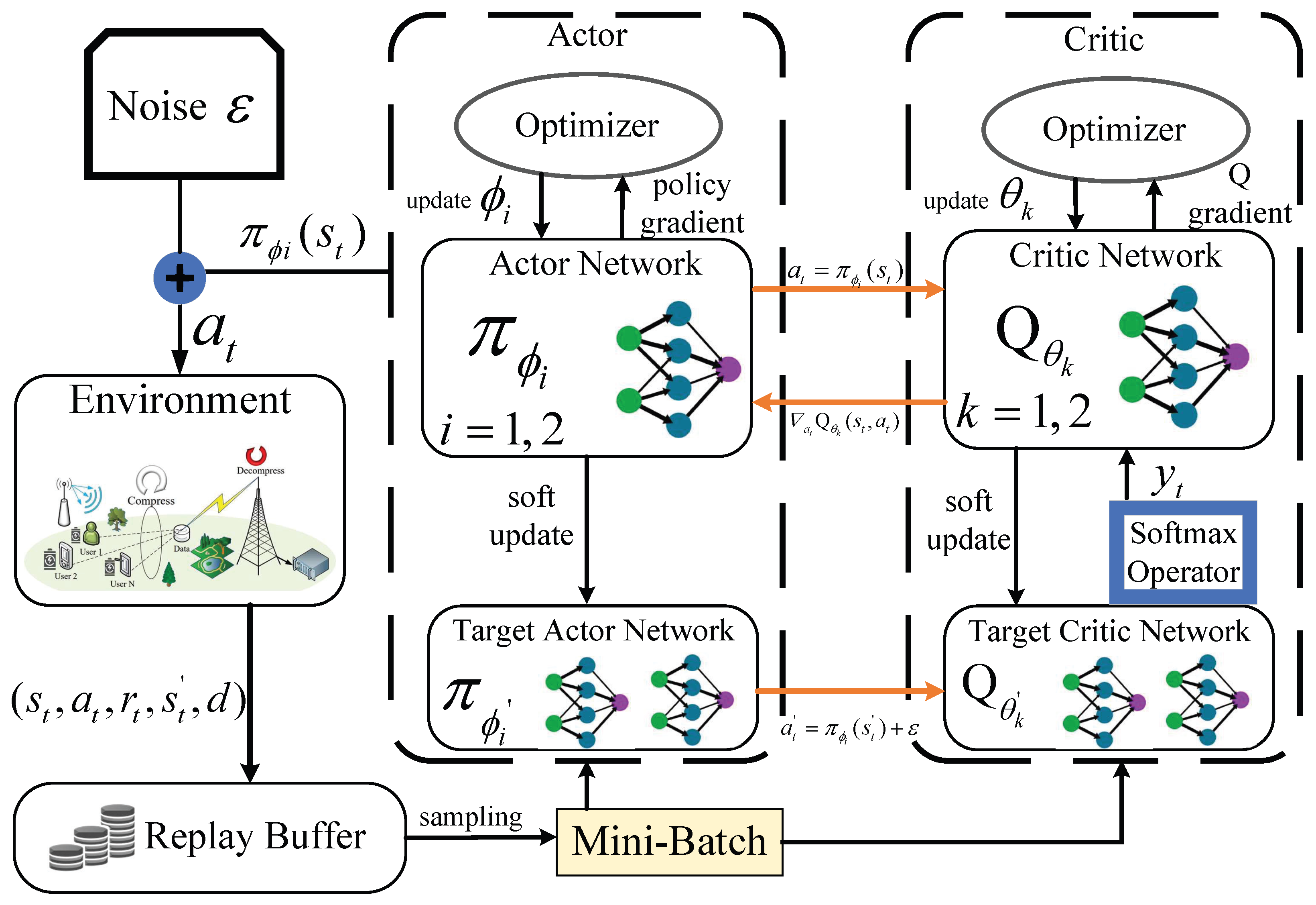 To cope with the above challenges, this paper constructs a NOMA-MEC network architecture based on data compression. By establishing a joint optimization model of computational resources, offloading strategies, and compression ratios in a dynamic environment, the total task processing latency is minimized under constraints such as the user’s battery capacity and the MEC server’s computing power, by exploiting a DRL framework based on Softmax Deep Double Deterministic Policy Gradient (SD3). Specifically, a composite state space integrating multi-user task specifications, real-time battery levels, and time-varying channel gains is firstly designed, and then a joint action space capable of simultaneously outputting continuous-valued compression ratios, offloading ratios, and server computational resource allocations is constructed. Finally a reward function incorporating penalty terms for constraint violations is designed. The main contribution of this paper is given as follows.