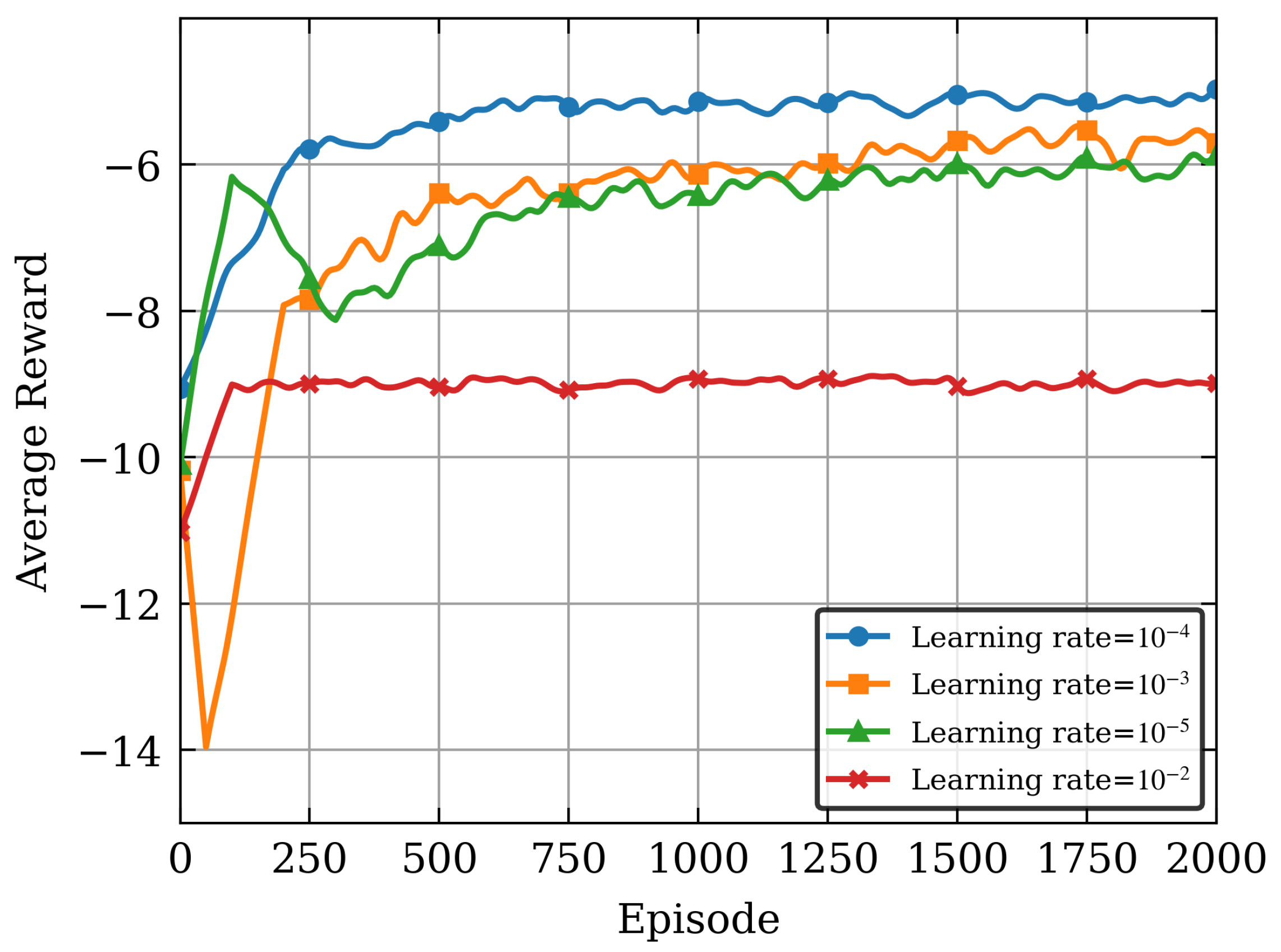 achieves approximately the best average reward. This also demonstrates that the algorithm is more sensitive to changes in learning rates. Moreover, it can also be seen that, there is a clear trade-off between the convergence speed and stability: higher learning rates offer faster convergence speed but with lower reward fluctuations, while lower learning rates provide slower learning processes but with higher reward.