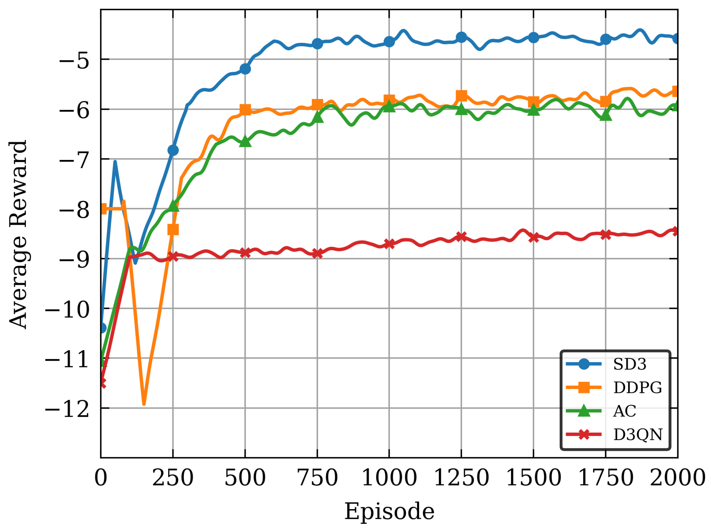 Table 1 that, while both AC and D3QN incur higher computational costs than SD3, they remain efficient within their respective learning paradigms. Overall, SD3 achieves advanced bias-variance trade-off without significant complexity increase, maintaining competitive efficiency among state-of-the-art DRL algorithms.
