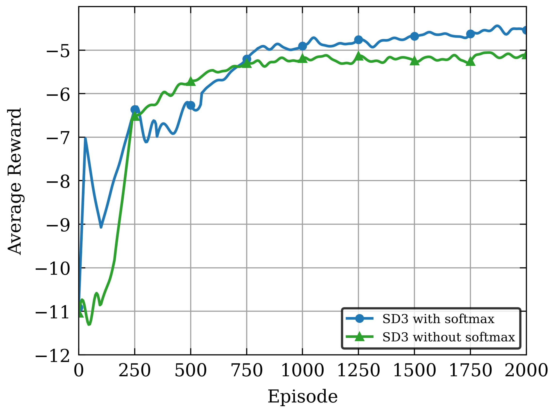 Moreover, to validate the effectiveness of the proposed softmax operator in balancing value estimation biases of the Critic network, we conducted an ablation study on the SD3 algorithm: the convergence performance was compared under two configurations with softmax operator (SD3 with softmax) and without softmax operator (SD3 without softmax) in