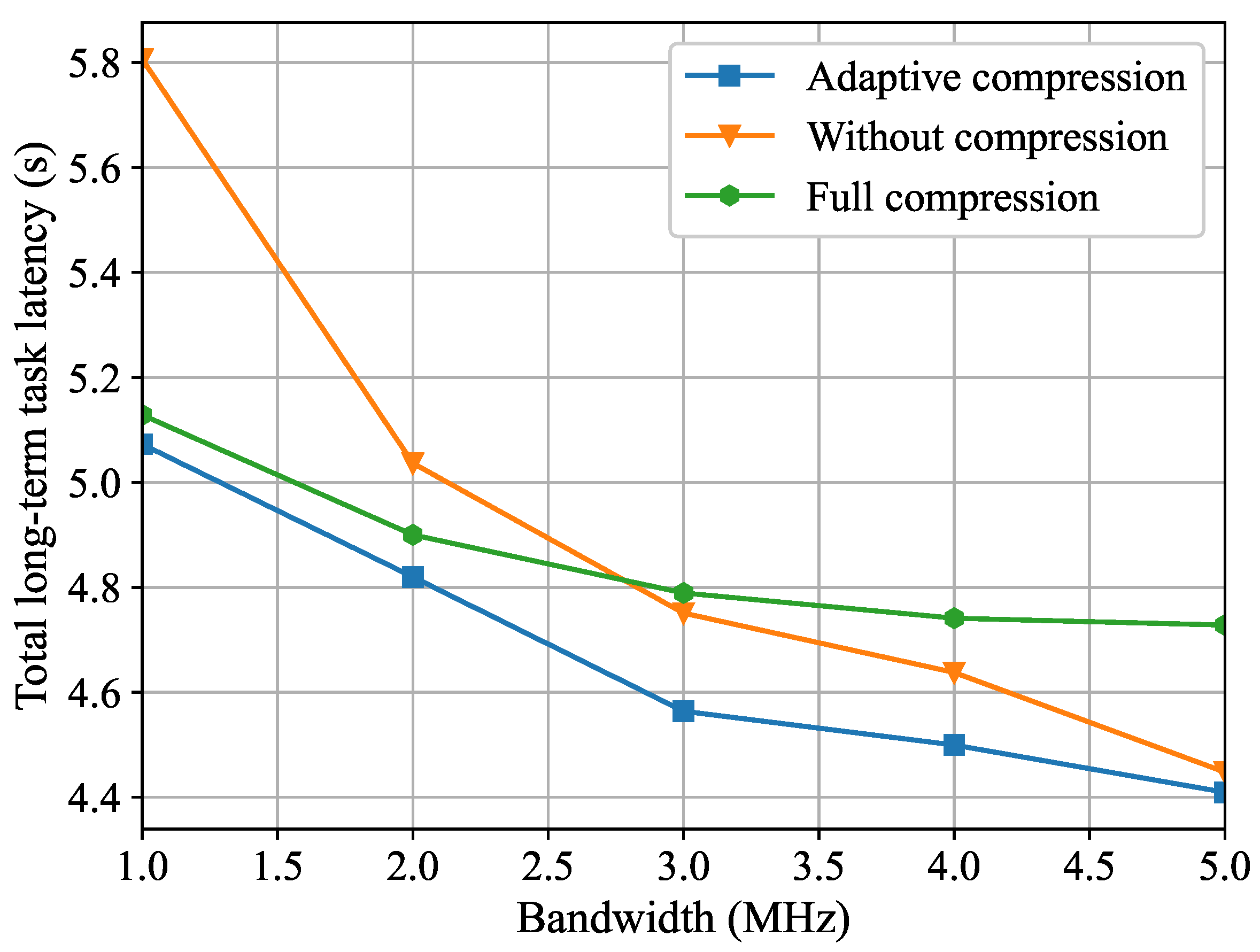 Figure 9, we can observe that, when the available bandwidth is limited, the full compression scheme will perform better than the scheme without compression. However, when the bandwidth reaches a certain value, the performance of the scheme without compression will be better than that of the full compression scheme. This is because when the bandwidth resources are sufficient, the transmission rate is already high enough, and the compression processing will add an additional burden to the transmission latency. Moreover, we also can see that the proposed adaptive compression scheme can dynamically modify the compression ratio in the offloading task according to the different channel bandwidths, thereby exhibiting superior performance compared to the two benchmark schemes.