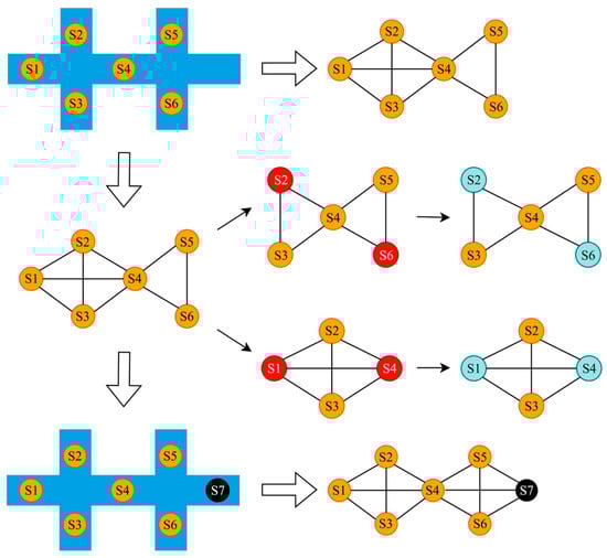 We defined the fused graph as . The node set was defined as , and denotes the physical nodes at time step . The edge set denotes both spatial connections and temporal state transitions across time steps. quantifies the correlation strength between all such spatiotemporal node pairs. On this graph, the input traffic data are represented as graph signals , and the goal of the GNN-based model is to learn a function to reconstruct the complete matrix . The forward and backward spatiotemporal adjacency matrices are constructed by splicing the spatial relationships and temporal state transition matrices, as shown in Equation (9):