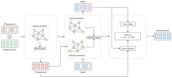 Unlike conventional methods, these hybrid methods utilize traffic physics to improve the estimation accuracy and precision. Performance improvements in hybrid methods primarily come from two aspects: data augmentation and the structural integration of physical models [34]. For data augmentation methods, Zhang et al. augmented training datasets with traffic flow simulations to enhance machine learning models [35]. While more recent approaches have embedded physics directly into learning architectures, researchers have integrated traffic flow models into loss functions. Shi et al. proposed physics-informed deep learning with a fundamental diagram (FD) learner to encode physical complexity while maintaining trainability [36,37]. Huang and Agarwal integrated the LWR and cell transmission models into loss functions to address sparse and noisy data [38]. Pereira et al. embedded macroscopic flow discretization into recursive neural networks [39]. Zhang et al. used computational graph methods to infer FD parameters [40]. Then, researchers tried to integrate physics law into more complex deep learning structures. Thodi et al. incorporated kinematic wave theory into a convolutional network for estimating high-resolution velocity fields [41]. Pan et al. developed an FD–Markov–LSTM model that combined traffic physics with temporal sequence modeling [42].