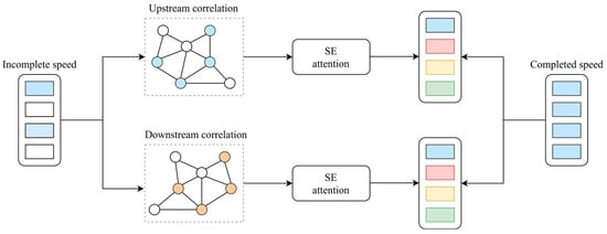 To address this limitation, we incorporated a channel attention mechanism, specifically the squeeze-and-excitation (SE) module [50], to project bidirectional diffusion features into the channel dimension. The mechanism of the squeeze-and-excitation diffusion convolutional network (SEDGCN) is shown in Figure 5. This enhancement leads to a refined model termed the SEDGCN, which modifies the foundational DGCN architecture through SE-based attention. By learning attention weights conditioned on both time steps and traffic states, the SEDGCN dynamically fuses forward and backward diffusion features. This enables the model to adapt to time-varying dependencies, thereby improving the TSE accuracy.