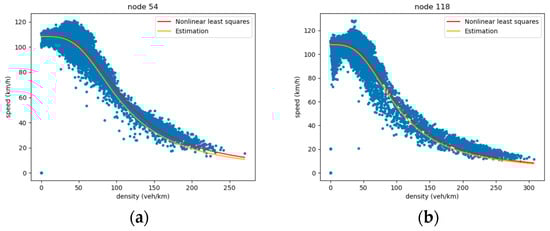 The DGCN model, by exploiting directional node relationships among nodes, provides an ideal solution for FD parameter estimation. The FD parameters derived through nonlinear least-squares fitting serve as training labels for the DGCN. Taking the s-shaped three-parameter (S3) traffic flow model [45] as an example, where the precise speed–density relationship is unknown, the S3 model characterizes this relationship as a nonlinear function: