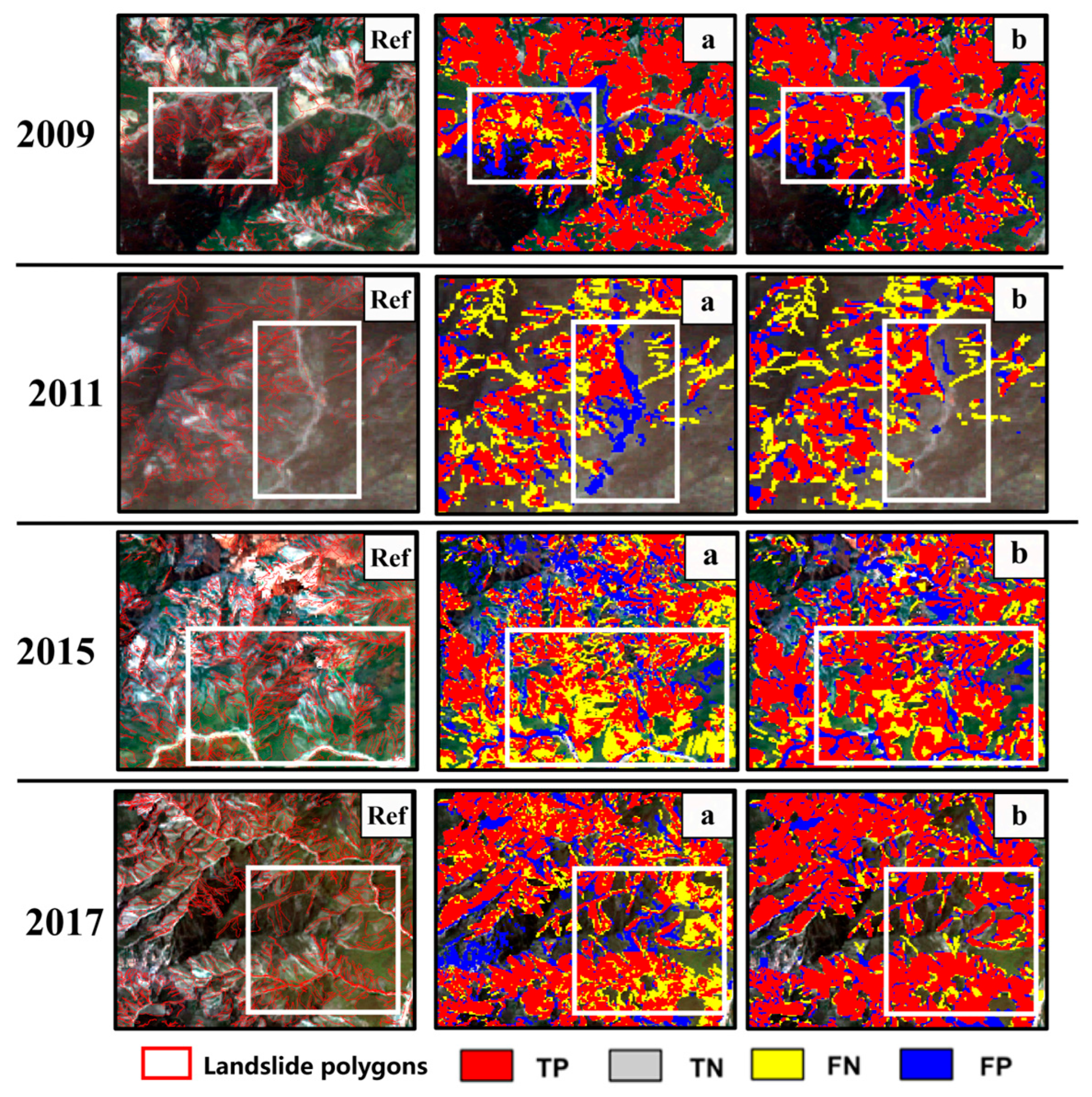 31], a validated study on Wenchuan earthquake-induced landslide mapping, while high-resolution Google Earth images were added for 2009, 2010, 2014, and 2016 to fill temporal gaps and ensure continuity of the time-series training dataset. Annotation of supplementary years followed Fan et al. [