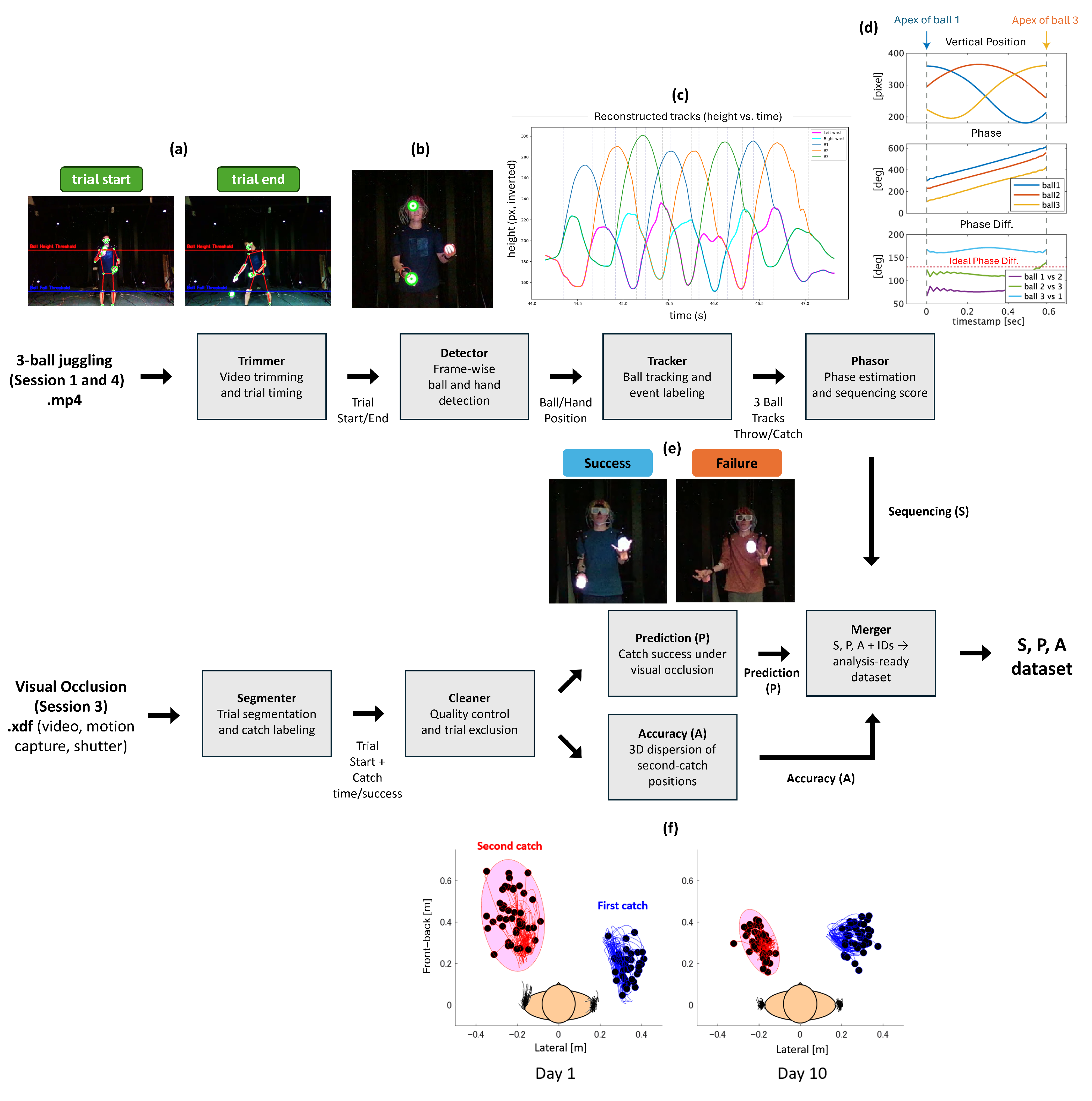 - Phase estimation and Sequencing score. In the final stage, we used the reconstructed trajectories to compute phases and derive a Sequencing score (Figure 3d). For each ball , the smoothed and mean-subtracted vertical position was converted to an instantaneous phase using the analytic signal from the Hilbert transform [28],where denotes the Hilbert transform.For windows containing three consecutive apexes from three different balls, we quantified how closely the three phases maintained the ideal spacing. Let be the phase of ball i in degrees and the usable time samples within window w (). The window-wise Sequencing score was defined aswhere is the circular difference (modulo ) between and the ideal spacing. Thus, takes values in , with indicating perfectly maintained phase offsets.Figure 3. Overview of processing pipeline for constructing Sequencing, Prediction, and Accuracy. (a) Display of trimming the RGB video into proper trials. The red horizontal line is a shoulder threshold, while the blue line is a knee threshold. LED glow balls’ positions are estimated and marked as green circles. (b) Display of detecting balls and hands positions of each frame. The balls are labeled as green circles, while the hands are labeled as red circles. (c) A graphical example of reconstructed tracks of balls and hands by the tracker. The x-axis is time (s), and the y-axis is height (pixel). The blue, orange, and green lines describe trajectories of 3 different balls, while the pink and light blue lines show the vertical movements of both hands. Sequencing is computed based on these reconstructed balls’ phases. (d) Phase estimation in the Phasor stage. The top panel shows vertical trajectories of the three balls, with apex times used to define windows. The middle panel shows the instantaneous phase of each ball (degrees), and the bottom panel shows pairwise phase differences compared with the ideal 120° phase difference. (e) Example of success and failure of the visual-occlusion task for computing Prediction (P). (f) Illustration of probability ellipsoid for computing Accuracy (A). The x-axis is the lateral distance (m) from the center of a participant’s body, while the y-axis is the front–back distance (m) [29]. Each black dot connected with a blue line means the position of a first catch with the right hand (in this case), and each black dot connected with a red line means the position of a second catch with the left hand. Pink ovals represent the 95% probability ellipsoid of second catch positions of each day. Most participants show a decrease in the ellipsoid volume throughout the training period (left → right).Figure 3. Overview of processing pipeline for constructing Sequencing, Prediction, and Accuracy. (a) Display of trimming the RGB video into proper trials. The red horizontal line is a shoulder threshold, while the blue line is a knee threshold. LED glow balls’ positions are estimated and marked as green circles. (b) Display of detecting balls and hands positions of each frame. The balls are labeled as green circles, while the hands are labeled as red circles. (c) A graphical example of reconstructed tracks of balls and hands by the tracker. The x-axis is time (s), and the y-axis is height (pixel). The blue, orange, and green lines describe trajectories of 3 different balls, while the pink and light blue lines show the vertical movements of both hands. Sequencing is computed based on these reconstructed balls’ phases. (d) Phase estimation in the Phasor stage. The top panel shows vertical trajectories of the three balls, with apex times used to define windows. The middle panel shows the instantaneous phase of each ball (degrees), and the bottom panel shows pairwise phase differences compared with the ideal 120° phase difference. (e) Example of success and failure of the visual-occlusion task for computing Prediction (P). (f) Illustration of probability ellipsoid for computing Accuracy (A). The x-axis is the lateral distance (m) from the center of a participant’s body, while the y-axis is the front–back distance (m) [29]. Each black dot connected with a blue line means the position of a first catch with the right hand (in this case), and each black dot connected with a red line means the position of a second catch with the left hand. Pink ovals represent the 95% probability ellipsoid of second catch positions of each day. Most participants show a decrease in the ellipsoid volume throughout the training period (left → right).To quantify the sequencing ability for each day, we pooled all valid sequencing windows () obtained from trials yielding at least one valid window across the analyzed sessions (Sessions 1 and 4). The day-level Sequencing index (S) was computed as the arithmetic mean of these pooled window values.