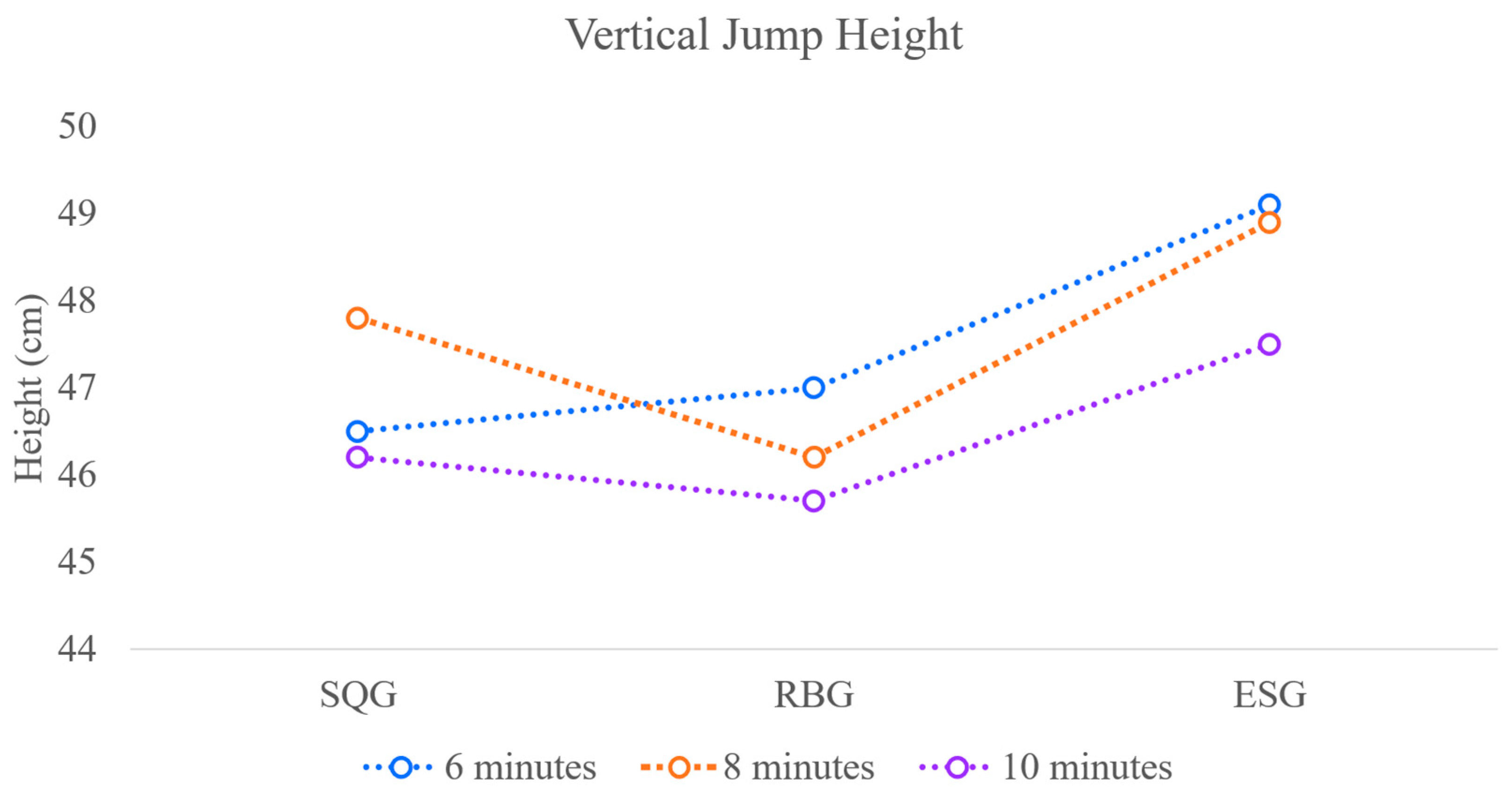 | 8 min after the intervention | 47.8 ± 3.1 | 46.2 ± 3.0 | 48.9 ± 2.7 | F = 9.31, p = 0.001 | ESG > RBG, SQG > RBG |