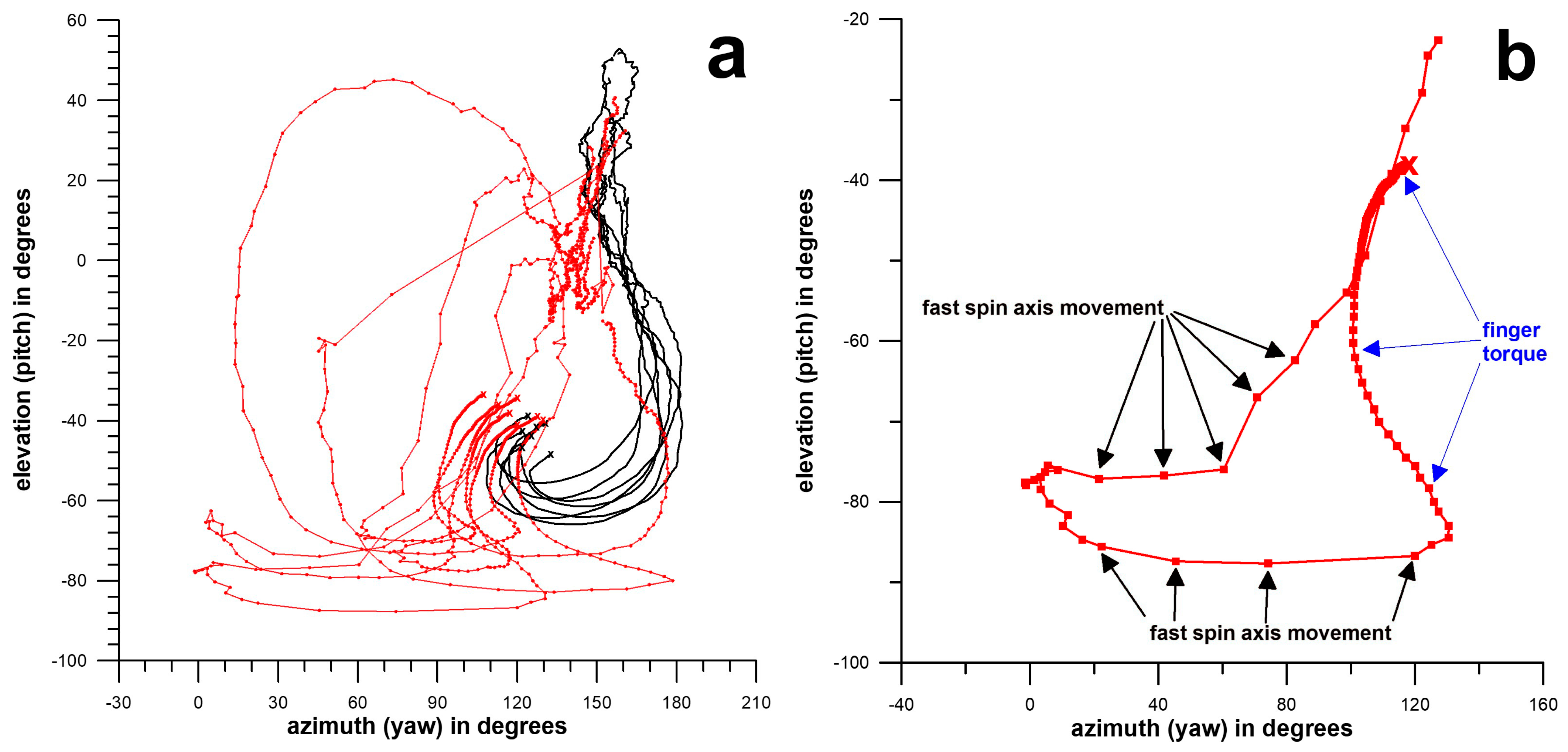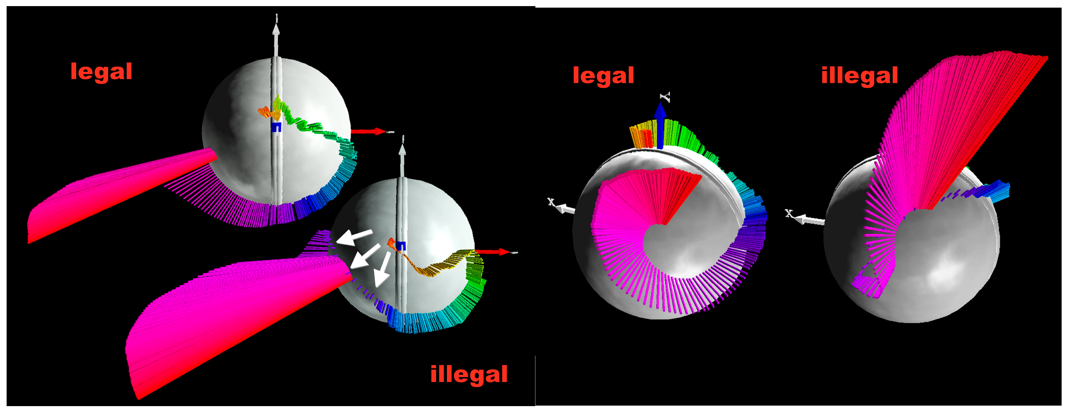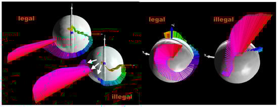 - The delivery type was identified by the smart ball after aligning the BCS with the global coordinate system (GCS; x—forward, direction of the ball’s flight; y—to the left; z—up) [29]. To achieve this alignment, the BCS was continuously rotated about the instantaneous angular velocity ω-vector by the angle φ, i.e., by the magnitude of the instantaneous ω/f, where f is the data sampling frequency (815 Hz). After each completed rotation step, the rotated BCS was rotated back into its original and initial position along with the instantaneous ω-vector [29]. Because the participants were right-handed off-spinners, the yaw (azimuth) and pitch (elevation) angles of the ω-vector in the GCS were both expected to be at 0° ± 22.5°, if the off-spin was a perfect side-spin.