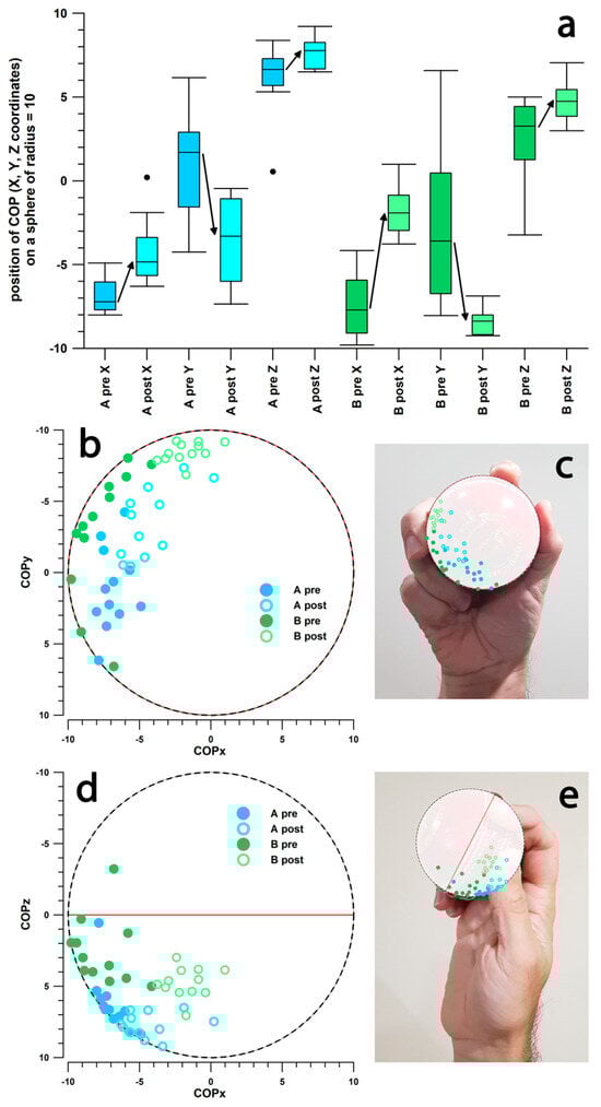 - The centre of pressure, which represents the point of torque application, was calculated according to the protocol of Fuss et al. [51]. For comparison purposes, the bowling hand was aligned with the ball’s coordinate system (BCS), the index finger was placed on the x-axis (seam plane = xy-plane), and the z-axis (pole of the ball) pointed into the palm of the right hand.