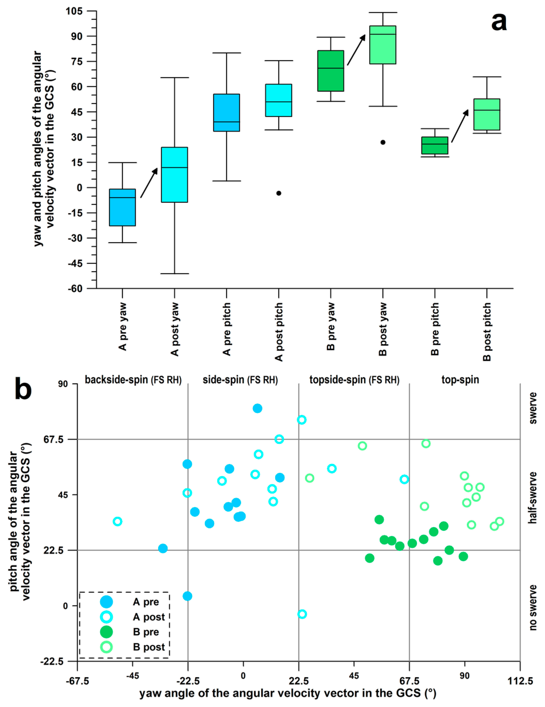 - The main limitation of this study is sample size (only two participants), which restricts the statistical power of the analyses and limits the generalisability of the findings. As such, the results should be considered preliminary and interpreted with caution. Nevertheless, the clear directional changes in elbow extension and smart-ball parameters provide encouraging evidence for the feasibility of the intervention. As focus was on the side effects of the intervention, irrespective of the outcome of the intervention itself, we compared the data of each parameter before and after the intervention with the MWU-test to detect any significant differences for each bowler individually. The focus of this study was not to compare different bowlers based on side effects which we did not know in the first place. If the number of side-effects were scarce and inconsistent between bowlers, a larger sample were justified to present the case of side-effects. Larger trials are needed to confirm these effects and determine whether the observed improvements can be reproduced in a broader population of spin bowlers. Notably, changes were detected not only in the primary target variable (∫p), but also in secondary measures, including the position of the centre of pressure (COP), the yaw angle of the angular velocity vector in the global coordinate system (GCS), and two skill-related parameters: precession and normalised precession. In addition, even with small subject numbers, the smart ball offers a means of validating a coach’s claims that a prescribed technical intervention has indeed led to tangible changes, rather than relying solely on self-report.