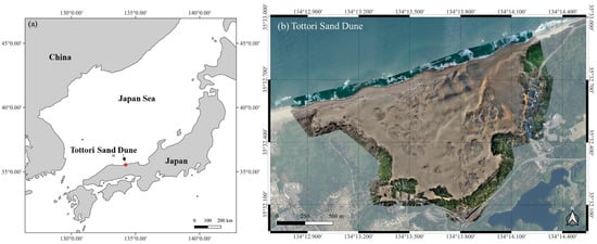 (a) Location of the study area in the Tottori Sand Dunes, western Japan, and (b) the extent of the UAV-LiDAR survey zone.