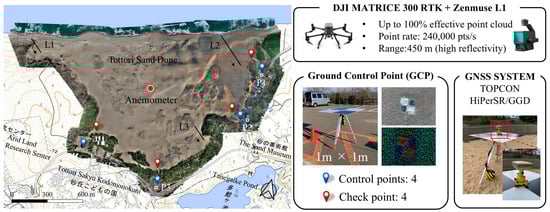 The study was conducted in the central tourist area of the Tottori Sand Dunes in western Japan (Figure 1). The survey area covered approximately 1.34 km2 and was characterized by dynamic dune ridges and anthropogenic sand fences installed for conservation. UAV-LiDAR surveys were conducted on 12–13 October and 9 December 2022, and on 11 January and 27 February 2023. The total four survey campaigns were conducted with the same UAV-LiDAR system setup, including the LiDAR sensor, GNSS system and GCP configuration (see details in Section 2.2 and Section 2.3).