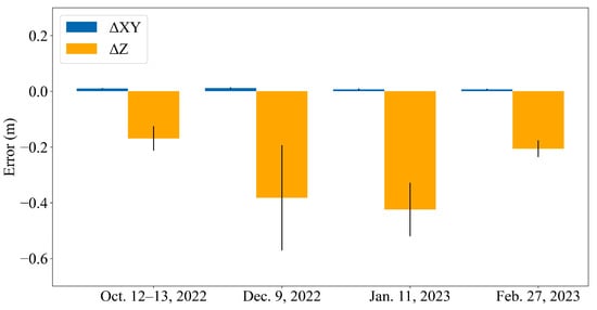 The accuracy of the generated point cloud was first evaluated using direct RTK-based georeferencing by computing the mean difference between the original point cloud and GNSS-measured check points. Horizontal (XY) differences were approximately 0.01 m, whereas vertical (Z) differences ranged from 0.17 m to 0.42 m (Figure 4) for the four checkpoints. These results indicate that although the point-cloud coordinates achieved centimeter-level horizontal accuracy, the vertical accuracy was degraded by the relatively large thickness of the DJI L1 LiDAR point clouds (ranging from 0.068 to 0.19 cm), resulting in substantial elevation uncertainty. Therefore, we applied additional processing to the point-cloud data.