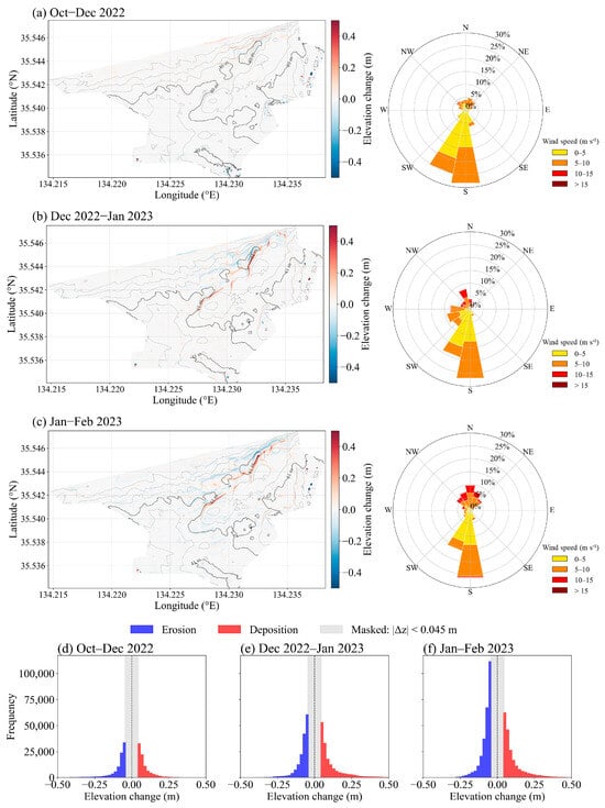 Spatial distribution of elevation changes in the study area, with prevailing wind directions indicated, for the periods: (a) October–December 2022, (b) December 2022–January 2023, and (c) January–February 2023. Positive values represent sand deposition, whereas negative values indicate erosion. Frequency distributions of elevation changes derived from DEM differencing for the same periods: (d) October–December 2022, (e) December 2022–January 2023, and (f) January–February 2023. Elevation changes with absolute values smaller than 0.045 m are masked (gray) to suppress minor variations likely associated with measurement noise. The dashed vertical line denotes zero elevation change.