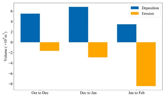 From October to December 2022, the predominant wind direction was from southern elevation changes (Figure 6a). Sand was transported northward of the second row of dunes by winds, after which deposition started. Approximately 5.5 × 104 m3 of sand deposition occurred, mainly northwest of the dune (Figure 7). Between December 2022 and January 2023, winds with speeds greater than 10 m s−1 blew from the northwest, resulting in the opposite direction of sand movement (Figure 6b). Affected by strong winds, approximately 6.8× 104 m3 of sand deposition occurred (Figure 7), mostly southeast of the second row of the sand dune and some around the third row of the sand dune. In the eastern part of our study area, where sand fences were constructed, wind-blown sand was trapped by the fences, resulting in sand deposition. Strong winds from the northwest to the northeast increased in January and February, resulting in a wide distribution of sand deposition (Figure 5c). Approximately 3.5 × 104 m3 of sand deposition during this period continuously occurred across the study area (Figure 7). Sand deposition southeast of the second row of sand dunes and around the third row of sand dunes became more severe.