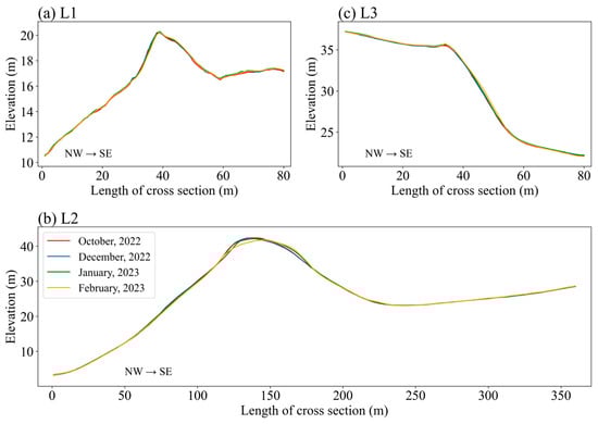To detect topographic changes in the sand dune areas, three terrain profiles depicting the elevations of the cross-sections were examined on the basis of the differences in the point clouds between October and December 2022, December 2022 and January 2023, and January and February 2023. Elevation changes were detected in the sand dune areas at L2. The top elevation of the sand dune in L2 was 42.4 m in October and then gradually decreased. From January to February, the top elevation decreased by approximately 0.4 m (Figure 8b).