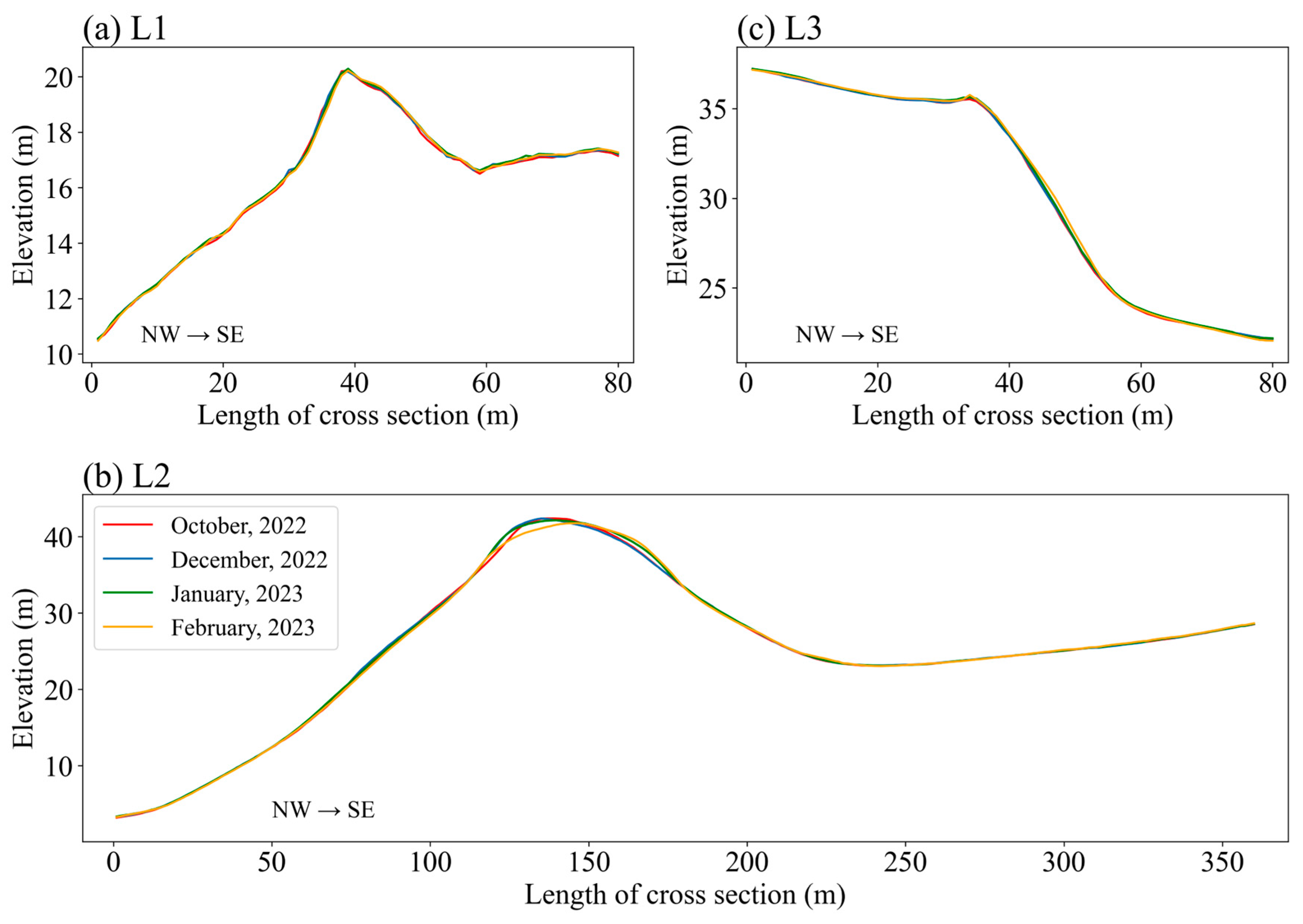- Subtle dune dynamics, including elevation changes of up to 0.4 m associated with wind-driven sand transport, were detected.