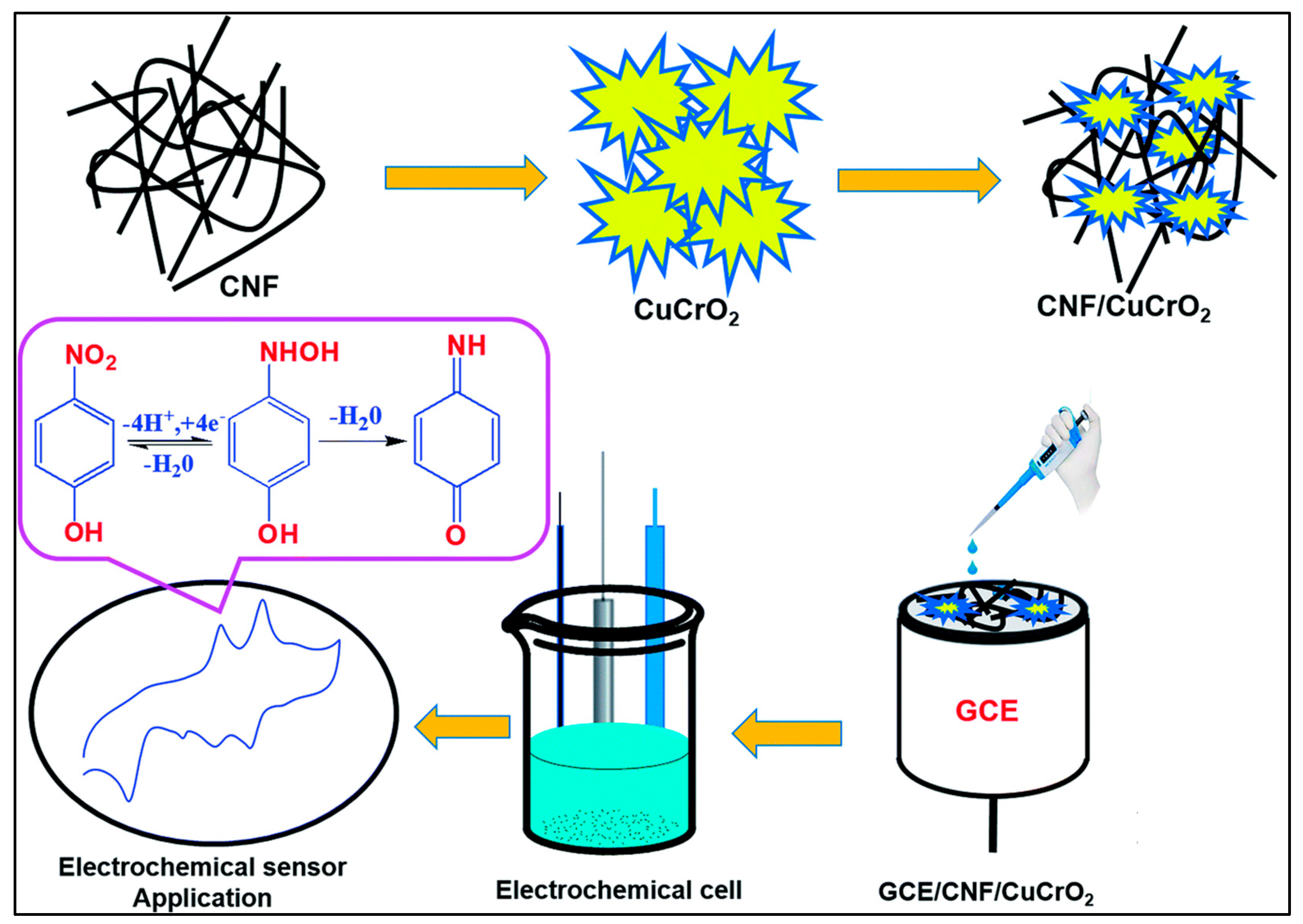 - Wang, X.; Karaman, C.; Zhang, Y.; Xia, C. Graphene oxide/cellulose nanofibril composite: A high-performance catalyst for the fabrication of an electrochemical sensor for quantification of p-nitrophenol, a hazardous water pollutant. Chemosphere 2023, 331, 138813. [Google Scholar] [CrossRef] [PubMed]