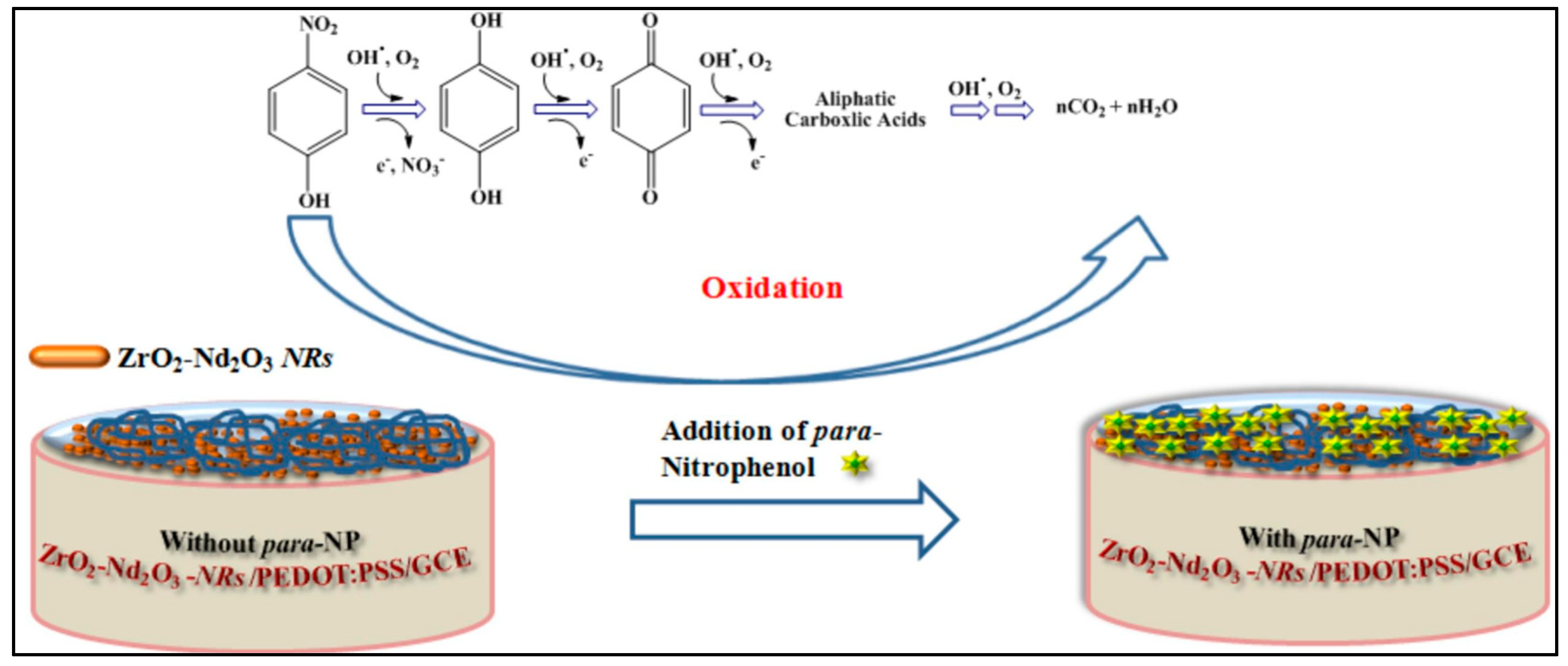 - Dildar, A.; Siddique, A.; Rabbee, M.F.; Rafiq, M.Z.; Althomali, R.H.; Sharif, S.; Jaber faifi, A.; Irfan, M.; Aljabri, M.D.; Akhtar, M.N.; et al. para-Nitrophenol detection by an electrochemical approach based on two-dimensional binary metal oxides ZrO2-Nd2O3 nanorod fabricated with PEDOT:PSS onto glassy carbon electrode. Microchem. J. 2024, 202, 110720. [Google Scholar] [CrossRef]