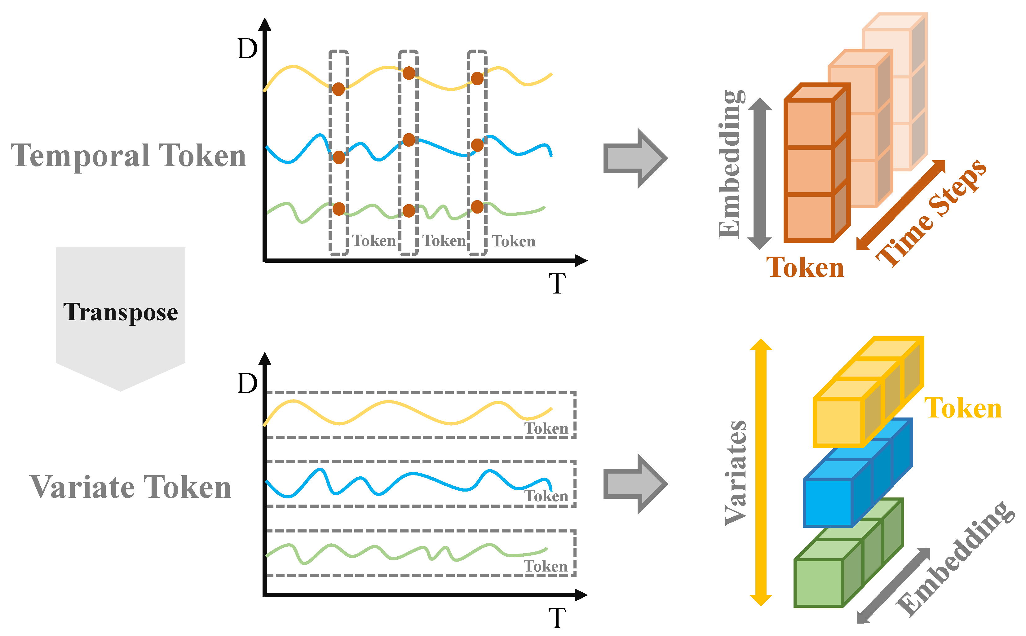 U, we transpose dimensions to treat variables as tokens and time points as features: