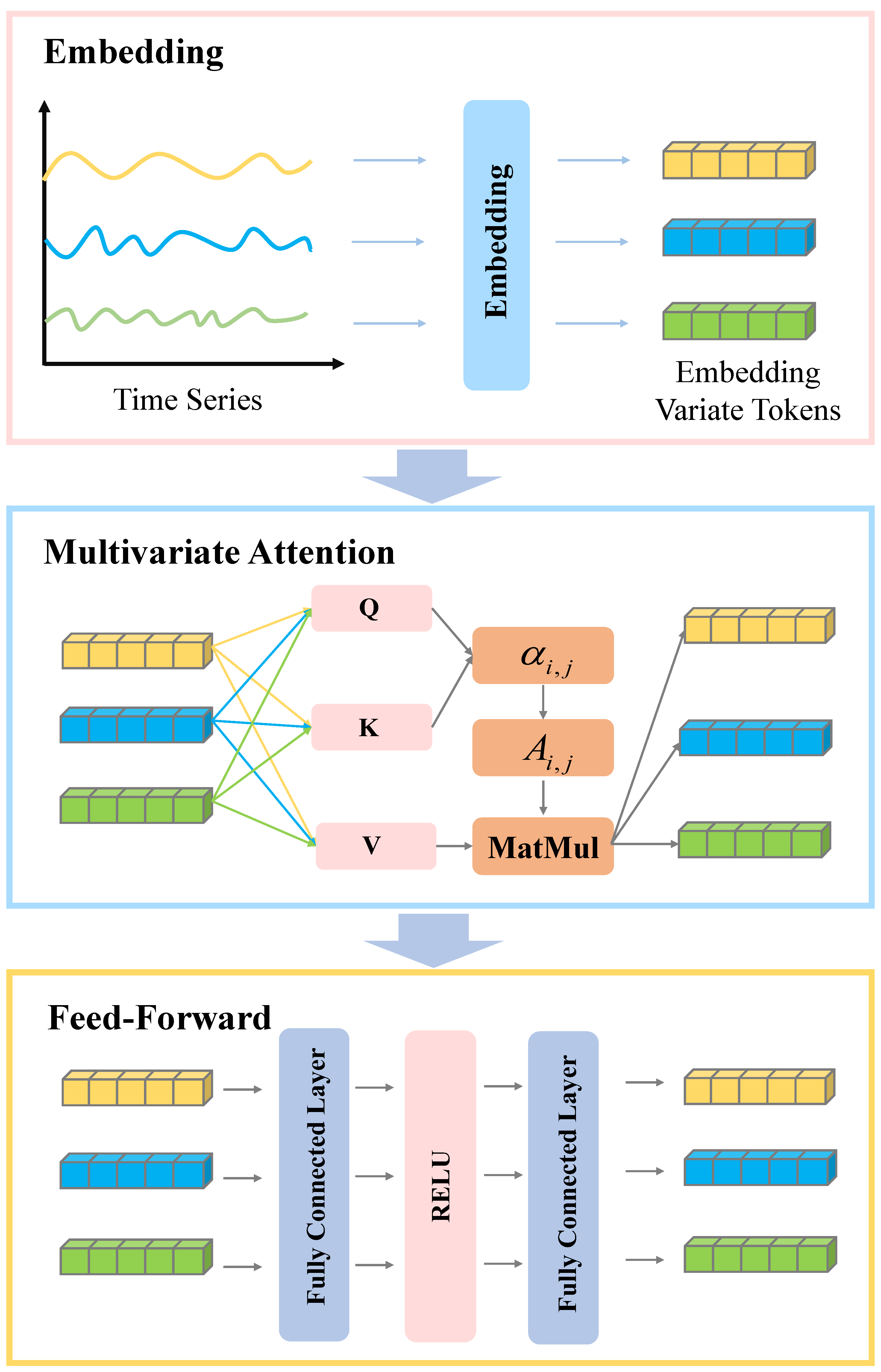 41], this module employs a dimensional Conversion approach, treating variables as tokens and time points as features. This shifts the application dimension of Self-Attention from the temporal axis to the variable axis, as illustrated in