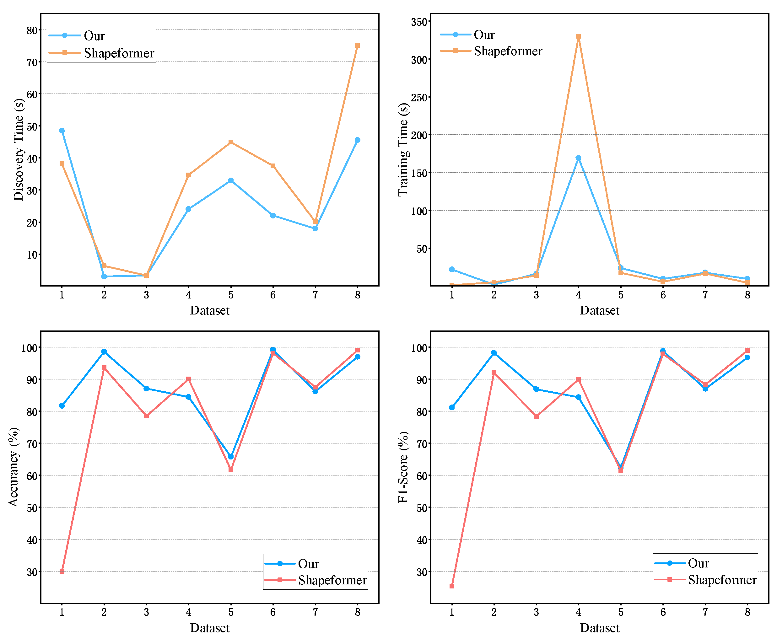 Figure 1 presents the overall methodological framework proposed in this study. To address the high computational overhead introduced by information gain calculations during Shapelet candidate selection in the original Shapelet discovery module, as well as the low training efficiency of the Transformer’s self-attention mechanism when processing large-scale time series data, we introduce two key structural enhancements to the ShapeFormer model. These improvements are designed to significantly boost both computational efficiency and temporal modeling performance.