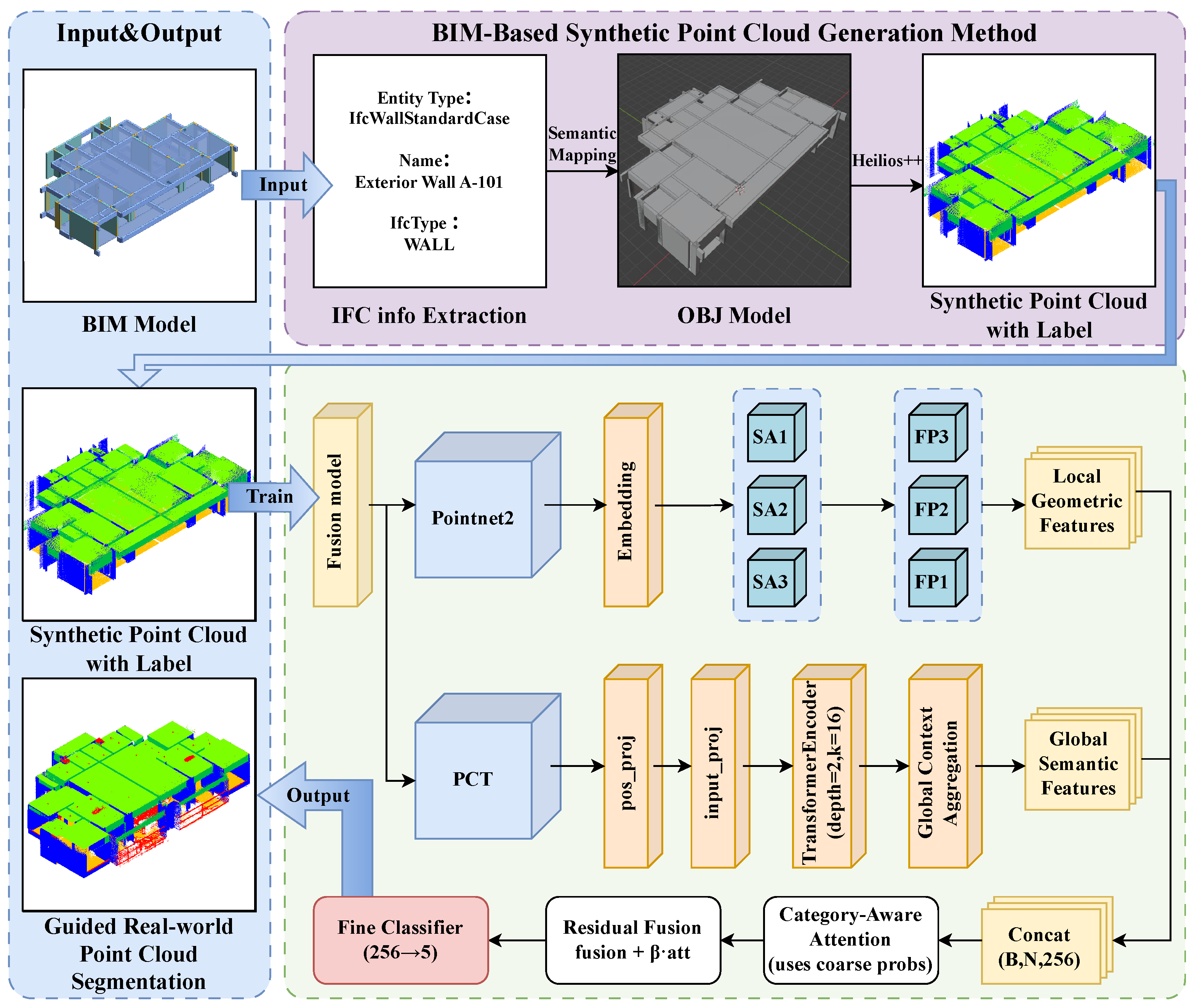 14], producing fully labeled training data without manual annotation. Third, the synthetic point clouds are partitioned into local blocks using a sliding-window strategy and used to train a Fusion segmentation network that combines local geometric features and global contextual information. Finally, the trained model is directly applied to real-world LiDAR scans for component-level semantic segmentation. This enables the semantic knowledge learned from virtual BIM-derived data to be effectively transferred to real construction scenes.