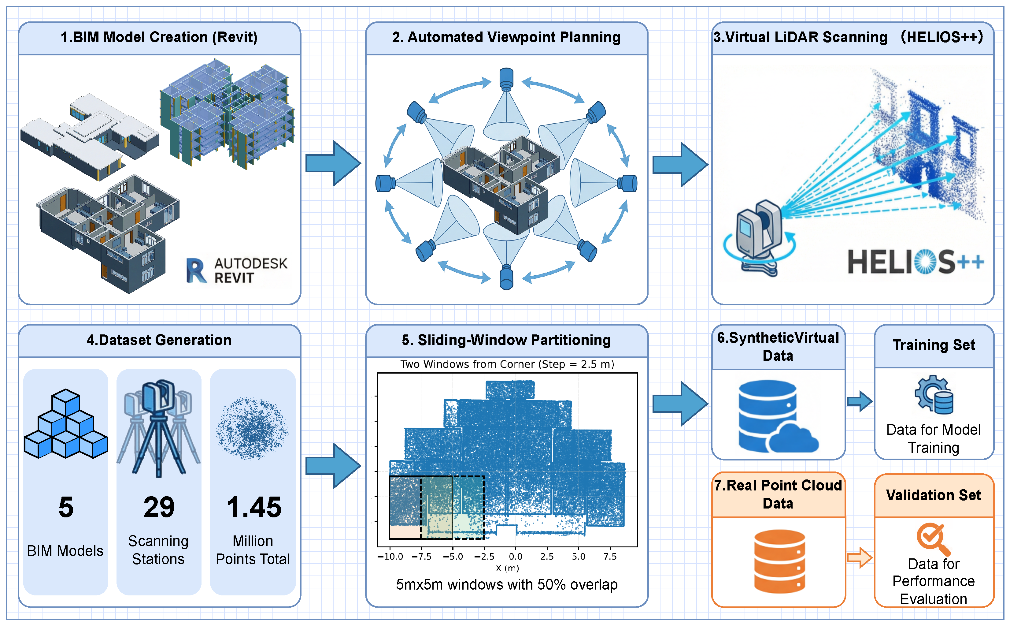 At a high level, the proposed method follows a simple virtual-to-real workflow. First, a Building Information Model (BIM) is constructed to provide accurate geometric and semantic descriptions of building components. Second, the BIM model is used to generate large-scale synthetic point clouds through virtual LiDAR scanning with HELIOS++ [