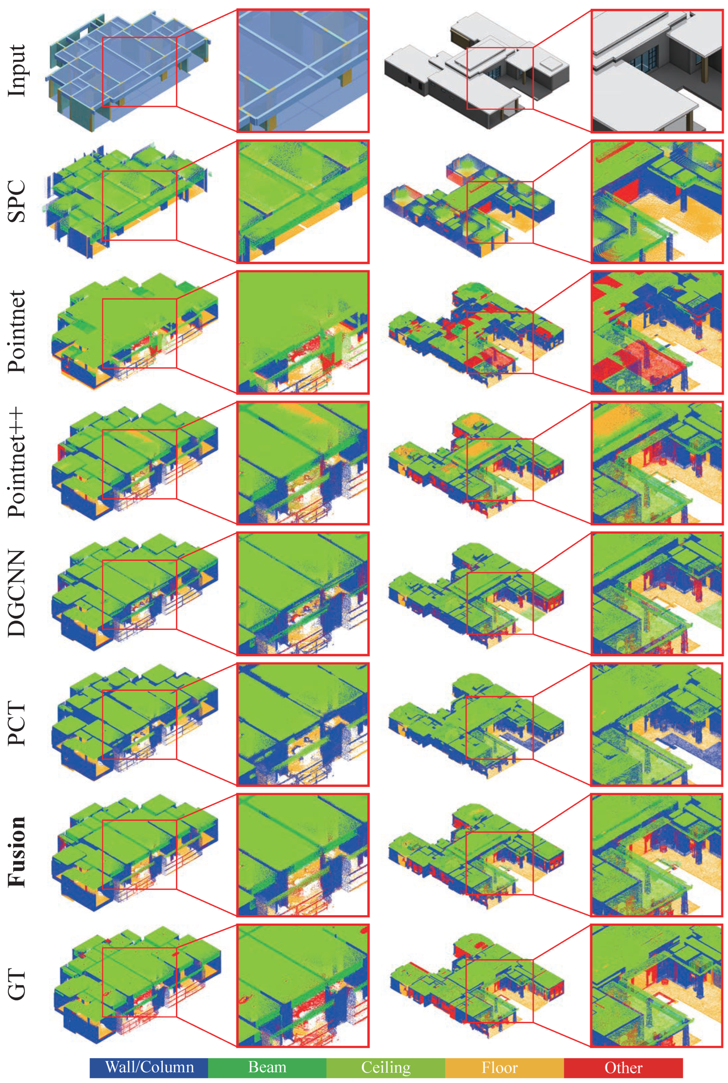 Figure 5 shows the input point cloud, the outputs of each model, and zoomed-in regions for visualization. The color map corresponds to five component categories: Wall/column, Beam, Ceiling, Floor, and Other.