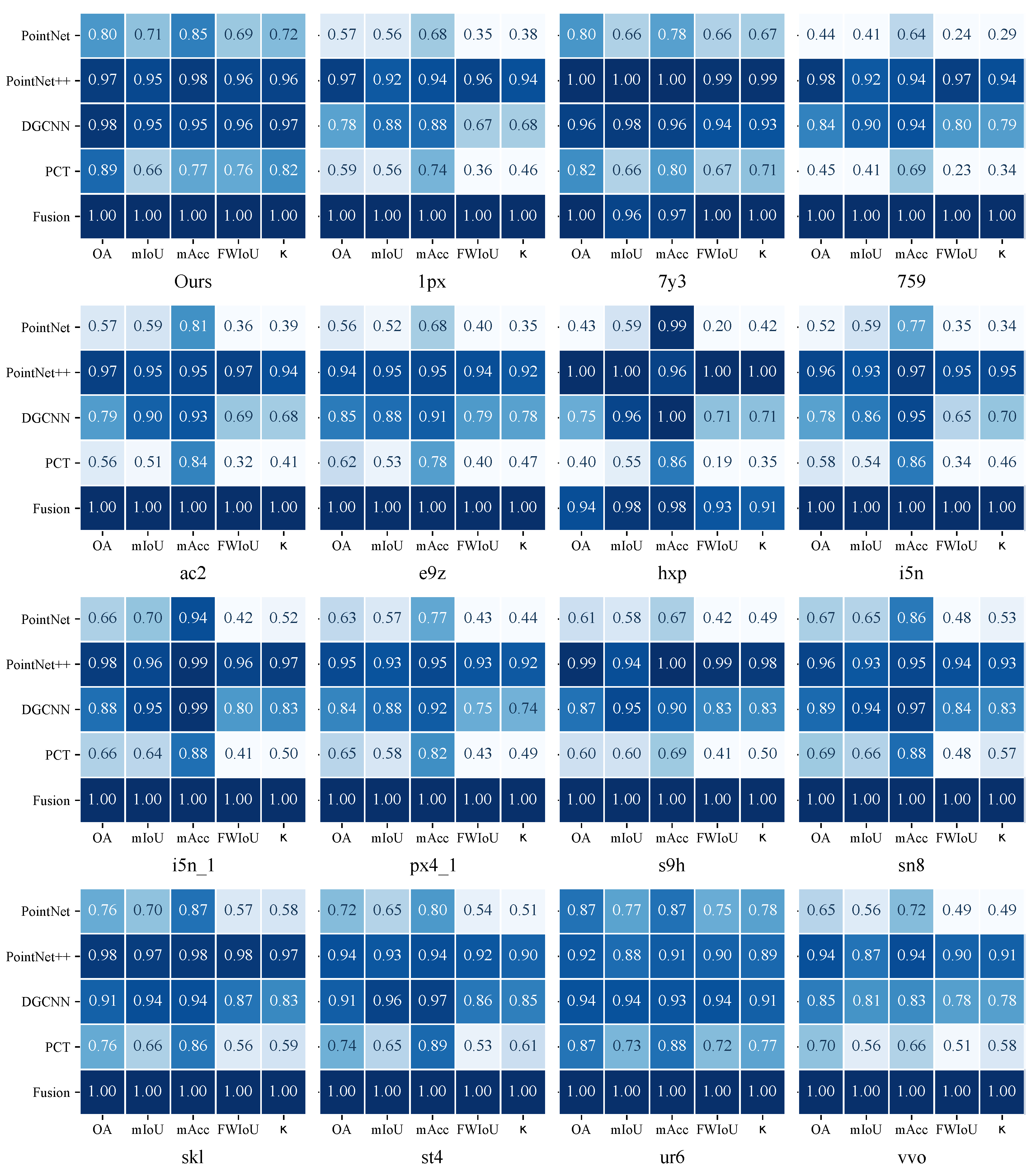 Beyond normalized visualization, the original metric values reveal that the proposed Fusion model achieves consistent and non-trivial absolute improvements over the strongest baseline across multiple scenes. For example, on the 759 scene, Fusion improves mIoU from 51.1% (PointNet++) to 55.5%, corresponding to a +4.4 percentage-point gain, which is the largest absolute mIoU improvement observed among all evaluated scenes. Meanwhile, Cohen’s increases from 54.9 to 58.2 (+3.3 pp), indicating substantially improved agreement between predictions and ground truth. These absolute gains confirm that the dominance observed in the normalized heatmap reflects meaningful performance improvements rather than a visualization artifact.