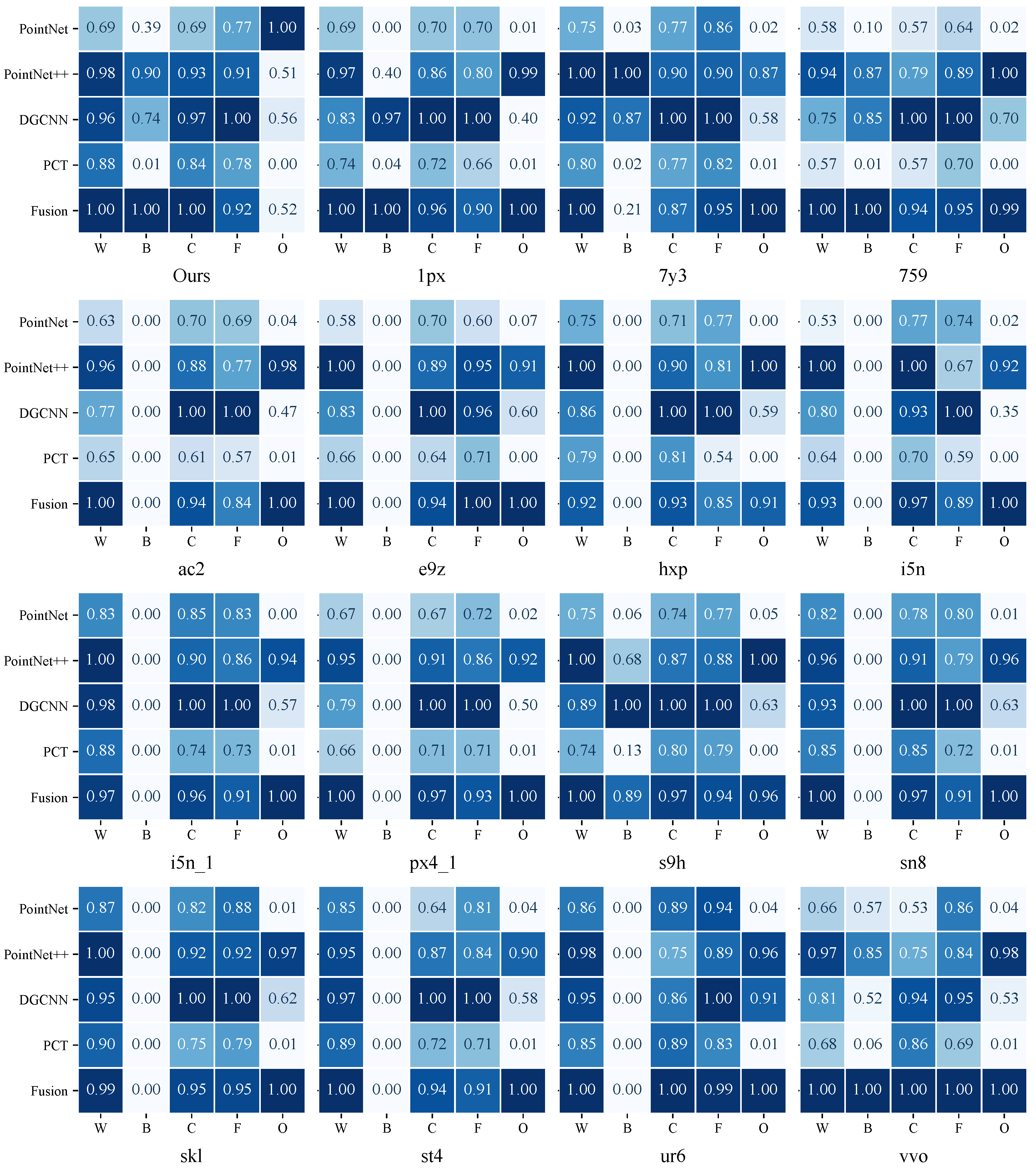 A statistical examination of the normalized matrix shows that the Fusion model achieves 73 highest values out of 80 scene–metric combinations, outperforming all other models in more than 90% of the evaluation entries. This result indicates that the Fusion model maintains consistently high performance across a wide range of scenes and evaluation metrics.Such consistency suggests stable accuracy and reliable geometric discrimination under varying structural layouts, point densities, and scanning viewpoints.