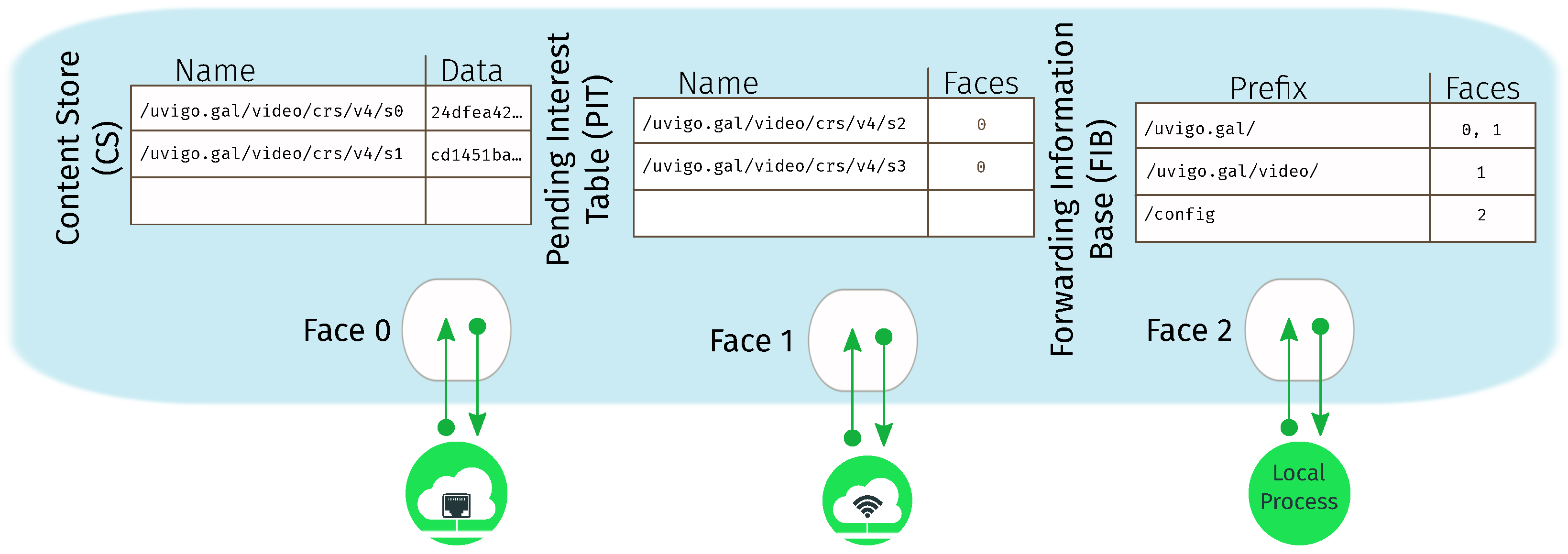 In traditional IP networks, when an IP node sends data to a peer, it simply adds the appropriate network header with the corresponding destination IP address to the data, and the network delivers it to the desired peer(s). NDN works differently. In NDN networks, communication follows a pull-based strategy in which consumer applications request data from the network that is ultimately provided by a producer application, usually residing on another host. This results in two different packets. The first one, demanding a named piece of content, is the Interest packet that arrives to an NDN node through one of its interfaces (faces in NDN parlance). The second one, containing the response, is the Data packet.