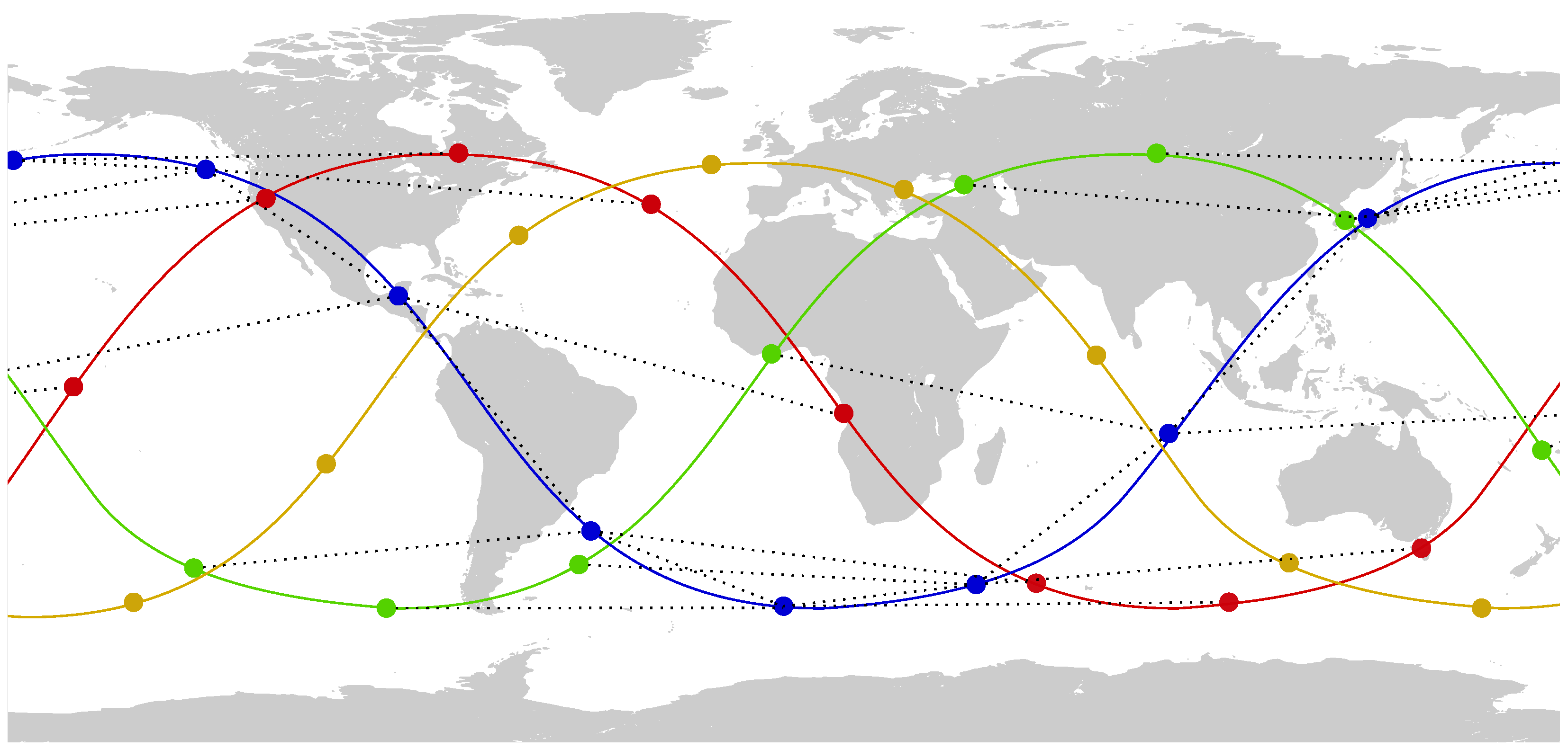 To avoid cluttering the figure, it represents a very small constellation with just four different orbital planes, each one with a distinct color and, with dotted lines, the ISL links of satellites in the blue orbital plane. Due to its small size, the H-ISL links shown cover long distances, but most commercial designs for massive LEO networks are a couple of orders of magnitude denser. Also note that the satellite in a neighboring plane may not coincide with the closest one at a given time, since the latter may be traveling in the opposite direction. For instance, the blue satellites in the figure establish links with the green and red satellites, but not with the yellow ones.