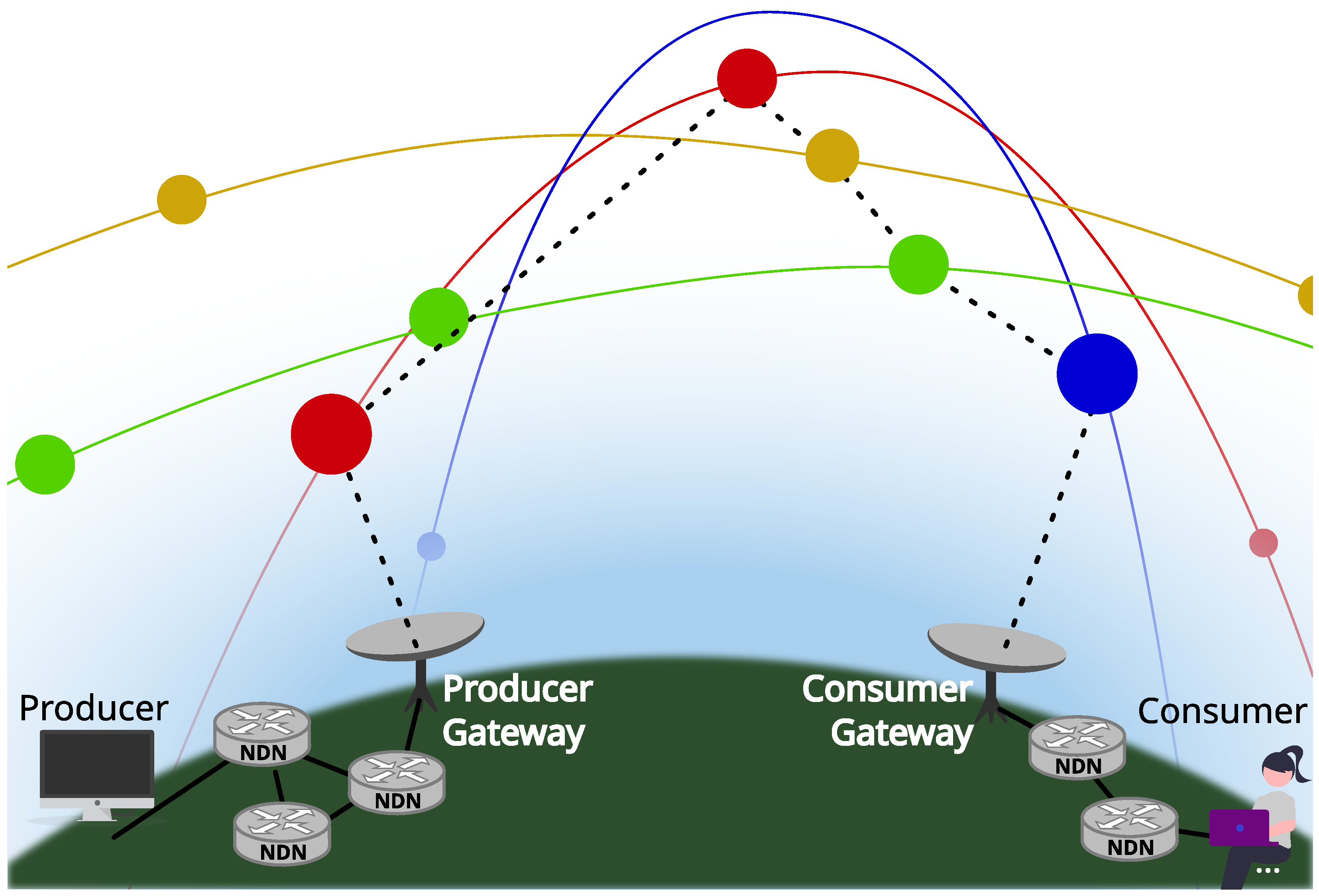 17]. We will obviate the routing of the requests from the consumer to the first ground station and from the second ground station to the producer, as those are already solved by the usual routing procedures. We also provide a scalable solution for locating the most appropriate ground node for a given producer.