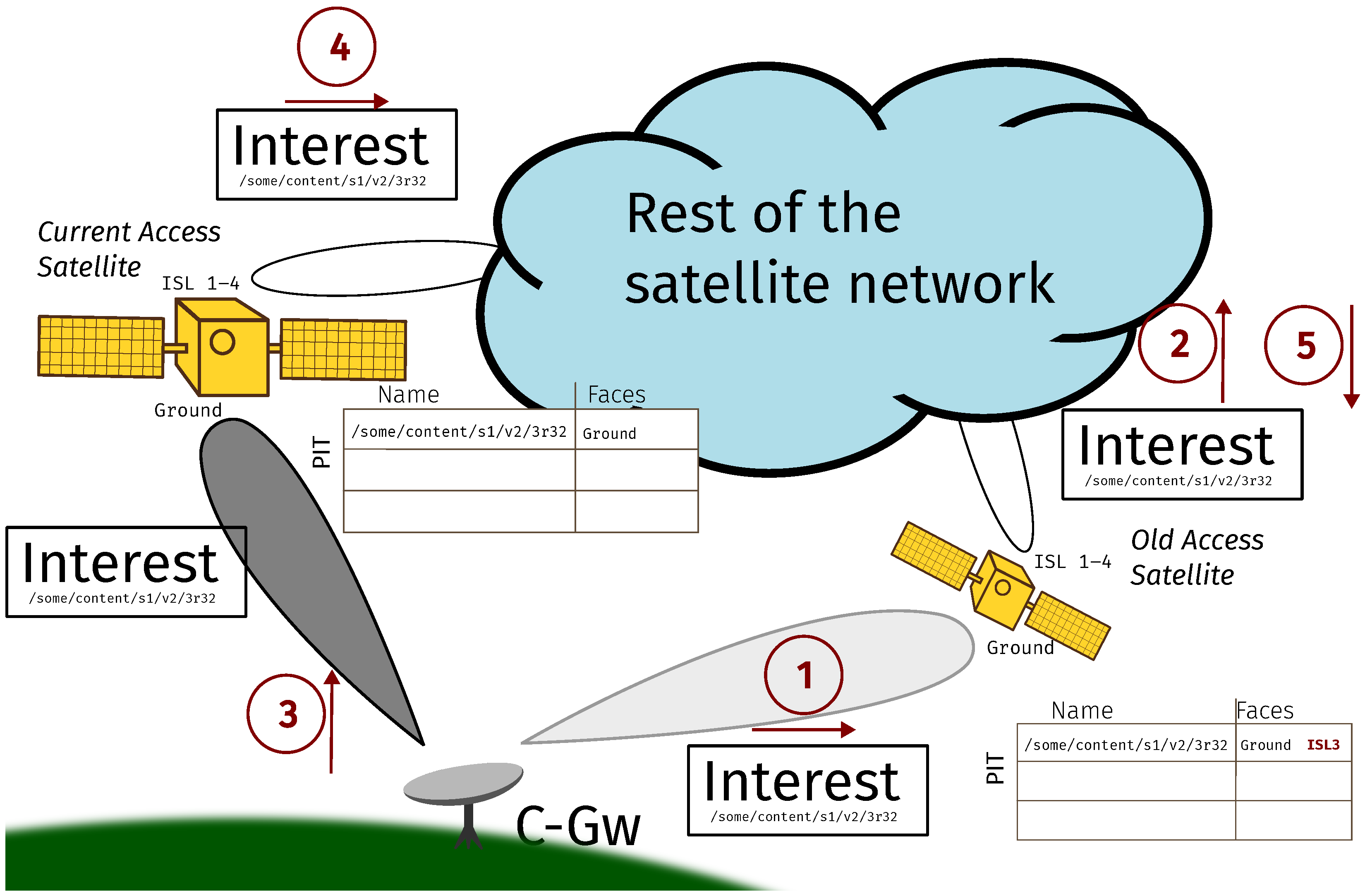 Consider a C-Gw that has some pending Interests that were transmitted via its old access satellite (represented by steps 1 and 2 in the figure). The old access satellite had already filled an entry in its PIT for each pending Interest of the C-Gw through its ground interface. Then, it forwards each Interest to the rest of the satellite network through one of its ISL links. After a C-Gw handover: